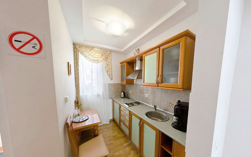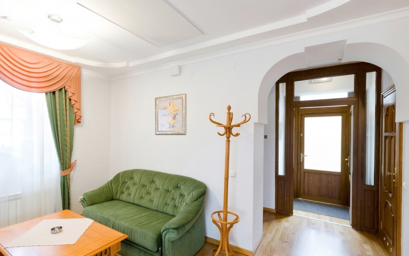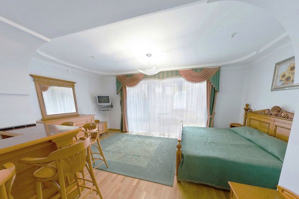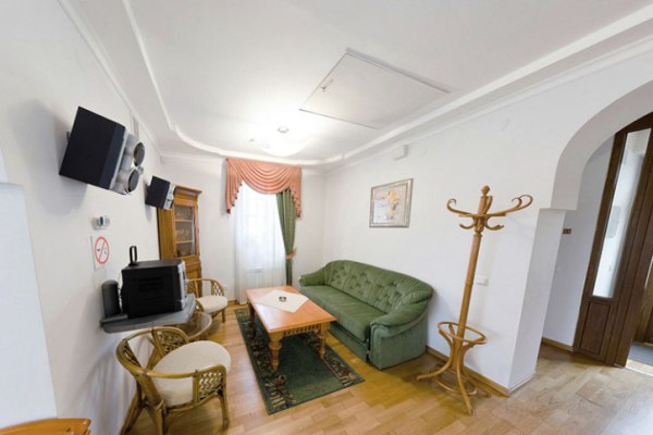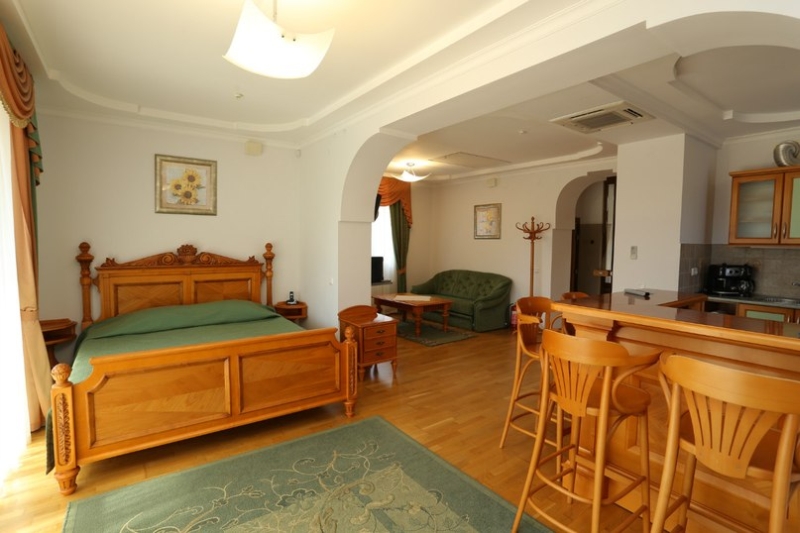 - 2-х местный 2-х комнатный номер повышенной комфортности. В номере: прихожая, гостиная и спальня. В прихожей находится встроенный шкаф-купе, угловая прихожая. В гостиной мягкий уголок (раскладной), обеденный стол, четыре стула, стенка комод с посудой, журнальный столик, холодильник, телевизор, фанкойл напольный. В спальной комнате двухспальная кровать, туалетный столик, прикроватные тумбочки, телевизор, фанкойл напольный, бра, люстра. Номер оборудован индивидуальным санузлом с душевой кабиной. Есть французский балкончик с видом на парковую зону и Генуэзскую крепость.