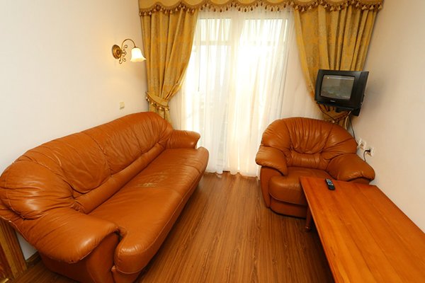- 2-х местный 2-х комнатный номер "Люкс"( 2 этаж ). В номере: гостиная и спальня. В гостиной находиться стол, шкаф для посуды, холодильник, мягкий кожаный уголок, телевизор, раскладное кресло, журнальный столик, телевизор, кондиционер, бра, люстра. В спальной комнате двухспальная кровать, туалетный столик, прикроватные тумбочки, кондиционер, бра, люстра. Раздельные санузел и душевая кабина, комната для багажа. Из каждой комнаты есть выход на балкон, вид на парковую зону и Генуэзскую крепость, на восток.