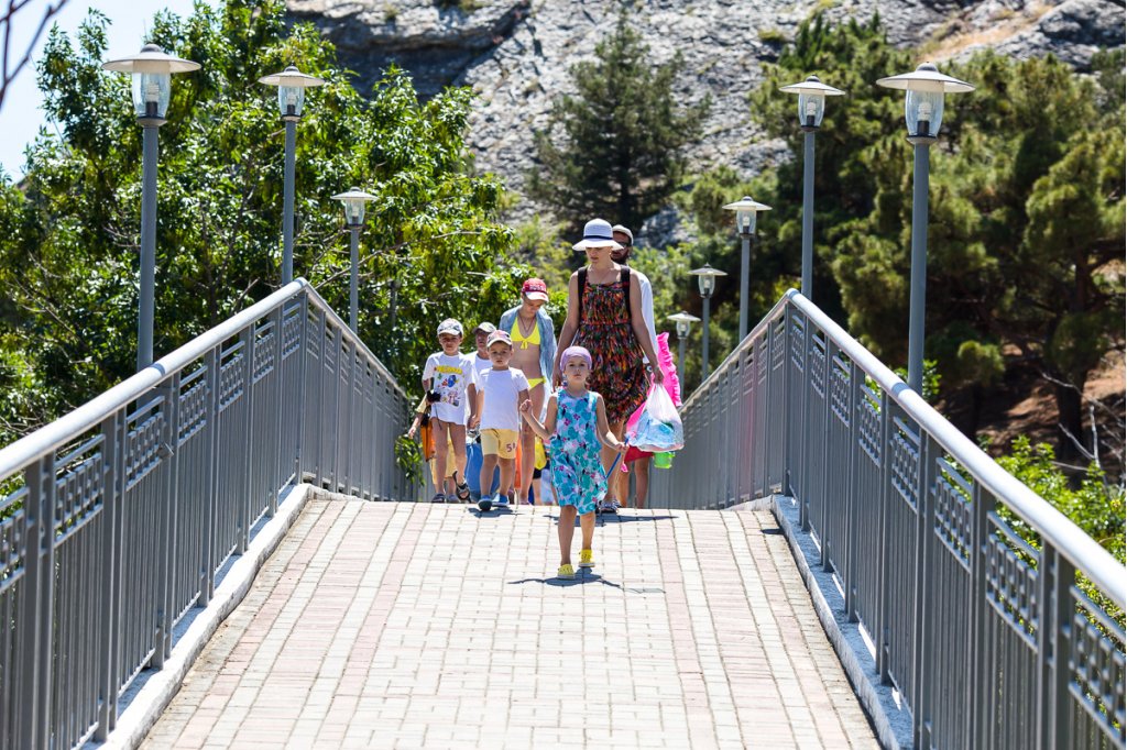 От пансионата до моря 300 м по пешеходной аллее. Пляж оборудован двухъярусным солярием , удобными лежаками из экологически чистого дерева. Здесь есть кафе, медпункт, пункт проката пляжного инвентаря, душ с пресной водой. На лодочной станции имеются катамараны, катер, скутер, лодки для морских прогулок. Пляж охраняется.