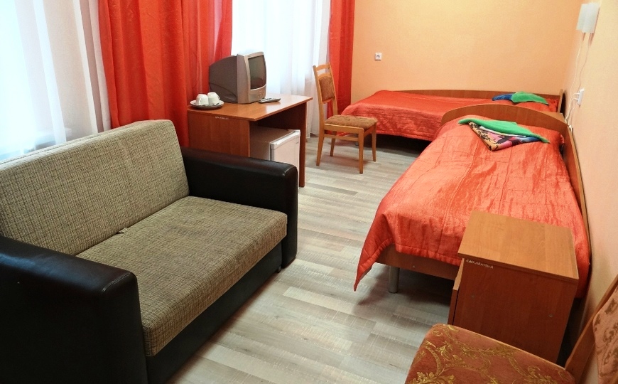 - 2-х местный 2-х комнатный c удобствами в номере (душ, туалет, умывальник): ТВ, холодильник, две односпальные кровати, в гостиной диван.