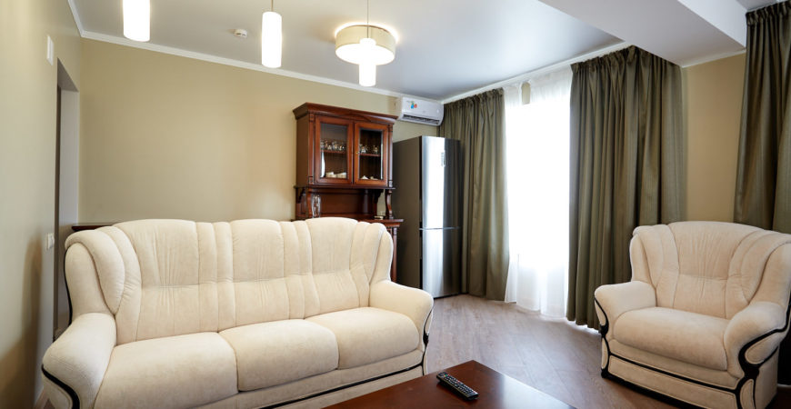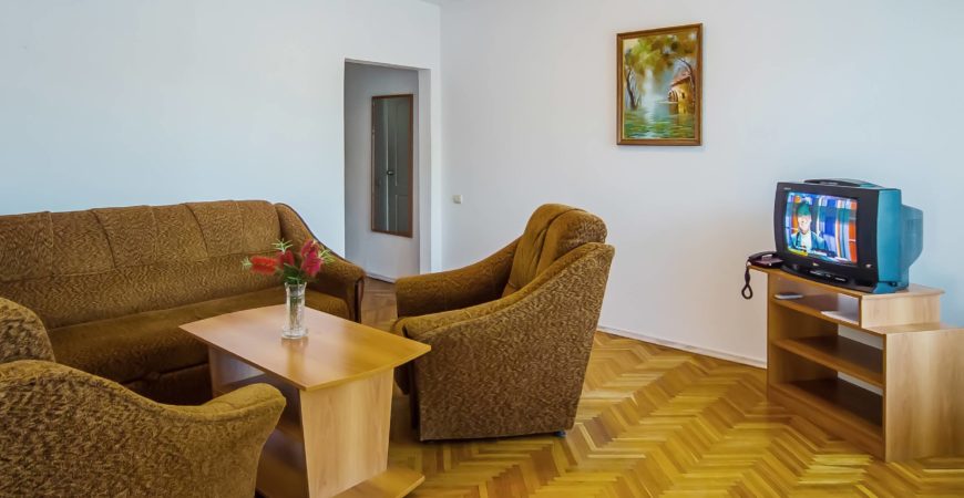 - 4-х местный 3-х комнатный «Семейный» — гостиная, 2 спальни, 2 лоджии, ванная, фен, кондиционер, холодильник, телевизор, телефон междугородной связи;