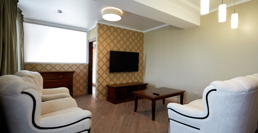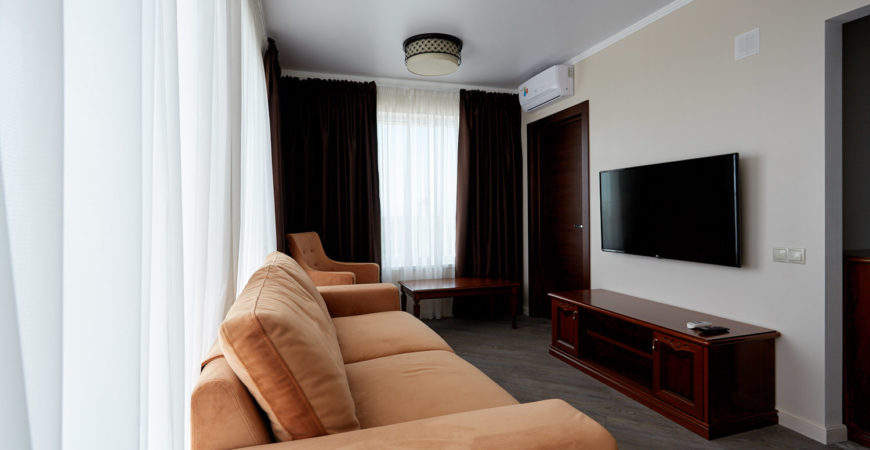 - 2-х местный 3-х комнатный «Люкс» — гостиная, спальная, рабочий кабинет, 2 лоджии, ванная,фен, кондиционер, холодильник, телевизор, телефон междугородной связи;