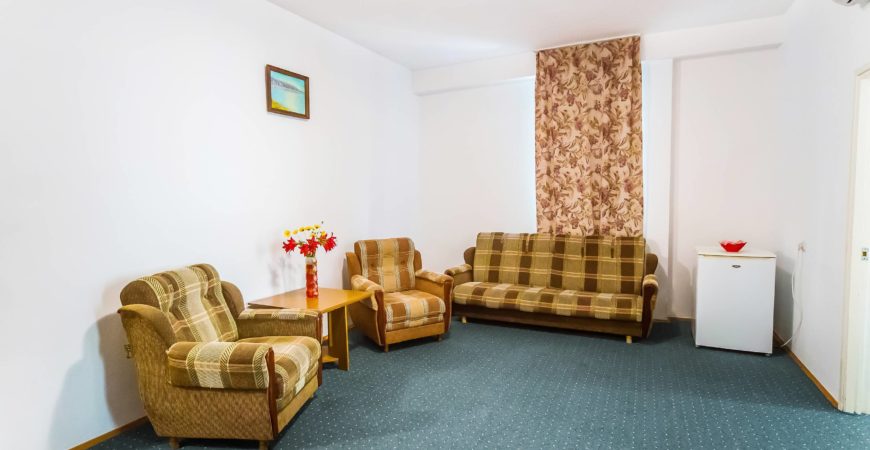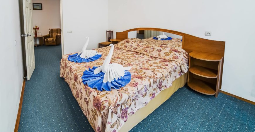 - 2-х местный 2-х комнатный «Люкс-комфорт» — гостиная, спальная, 2 лоджии, ванная,фен, кондиционер, холодильник, телевизор, телефон междугородной связи;