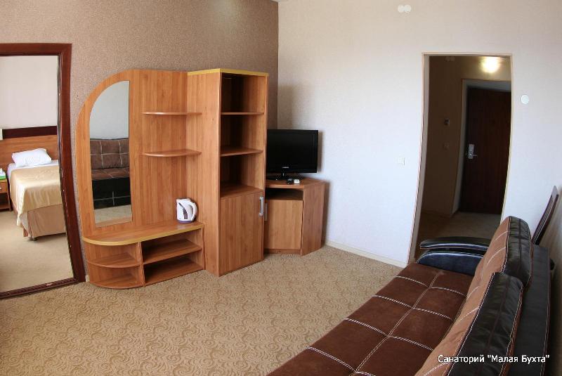 В номере: ванна, туалет, два ТВ, мини-бар, два кондиционера, набор посуды, двуспальная кровать, диван.