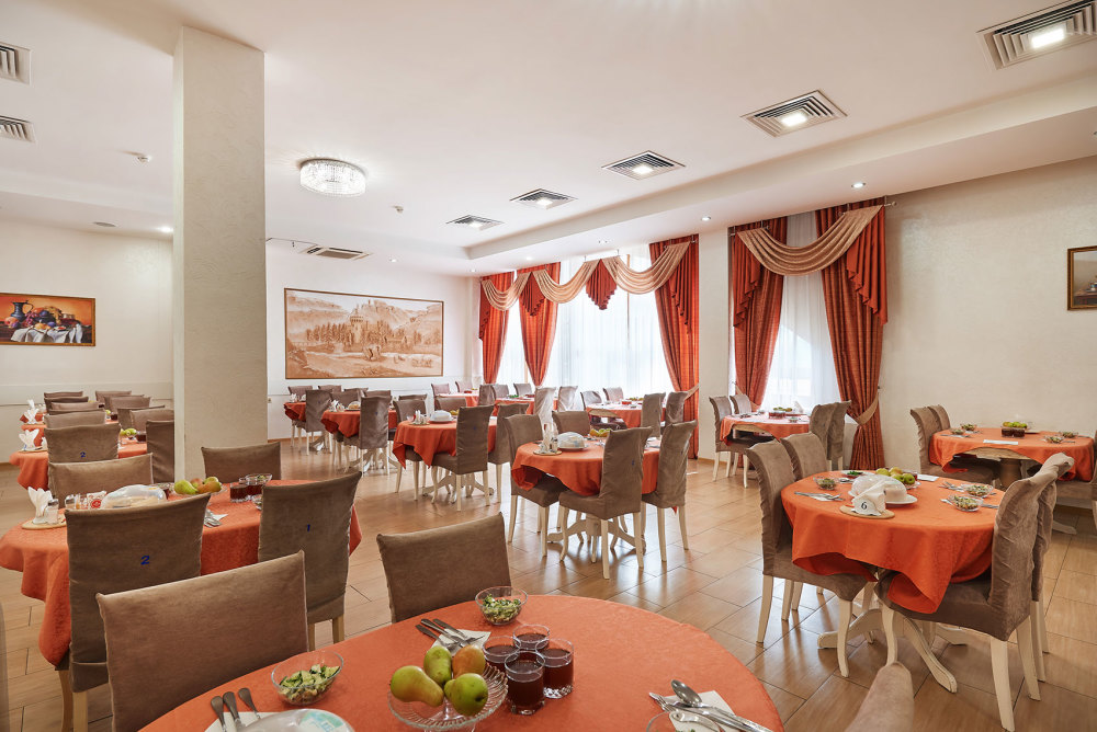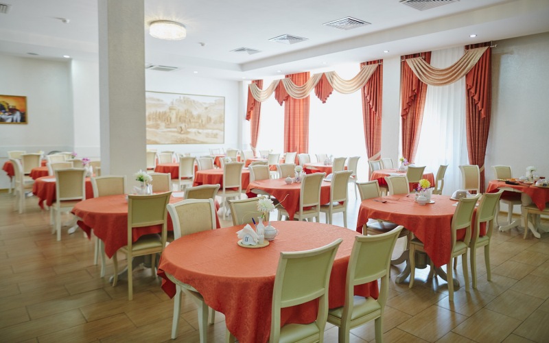 Для завтраков, обедов, ужинов и полдников предлагается несколько прекрасно оформленных залов. Есть летняя веранда, утопающая в зелени и свету, здесь особенно приятны вечерние чаепития. Также доступен стильный фитобар, где можно насладиться горячими и холодными напитками, попробовать закуски, полакомиться десертами.