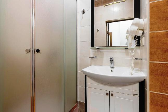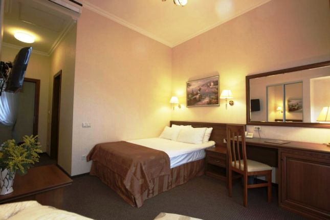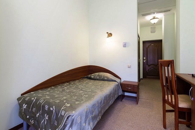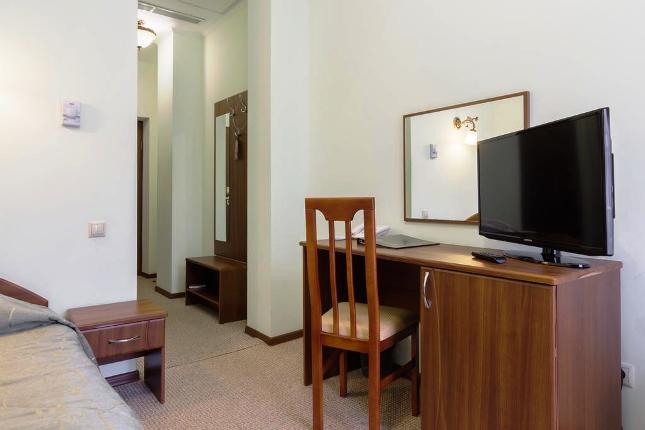 1-местный 1 категории. Однокомнатный номер с высоким потолком площадью 13 кв.м. В номере собственная ванная комната, односпальная кровать, шкаф, письменно-туалетный стол, тумбочка, телевизор, холодильник, система кондиционирования воздуха. Номера расположены в восточной части корпуса с видом на парк, без балконов.