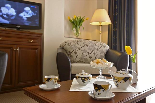 Джуниор Сюит комфорт. Просторный номер с высокими потолками, состоящий из прихожей, большой ванной комнаты и жилой зоны свободной планировки с неизолированными друг от друга спальней и гостиной, одним или двумя балконами с мебелью. В каждом номере есть кондиционер, телевизор, холодильник. С балкона открывается великолепный вид на море или вечнозеленый парк. Номер идеально подходит как для семейного отдыха с ребенком, так и для романтического путешествия.