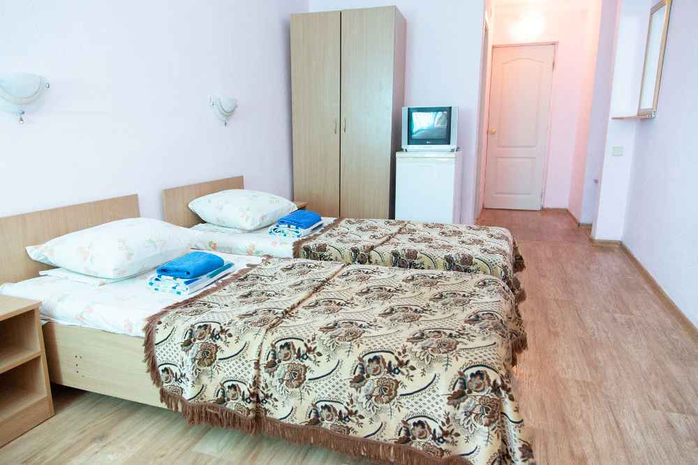 3-х местный стандарт. Площадь: 14-15 кв.м. В номере: три раздельные кровати, телевизор, холодильник, санузел с душем, балкон. Дополнительное место (еврораскладушка) возможно не во всех номерах.