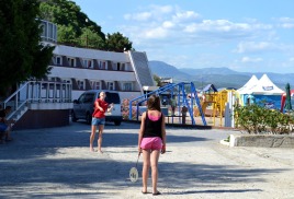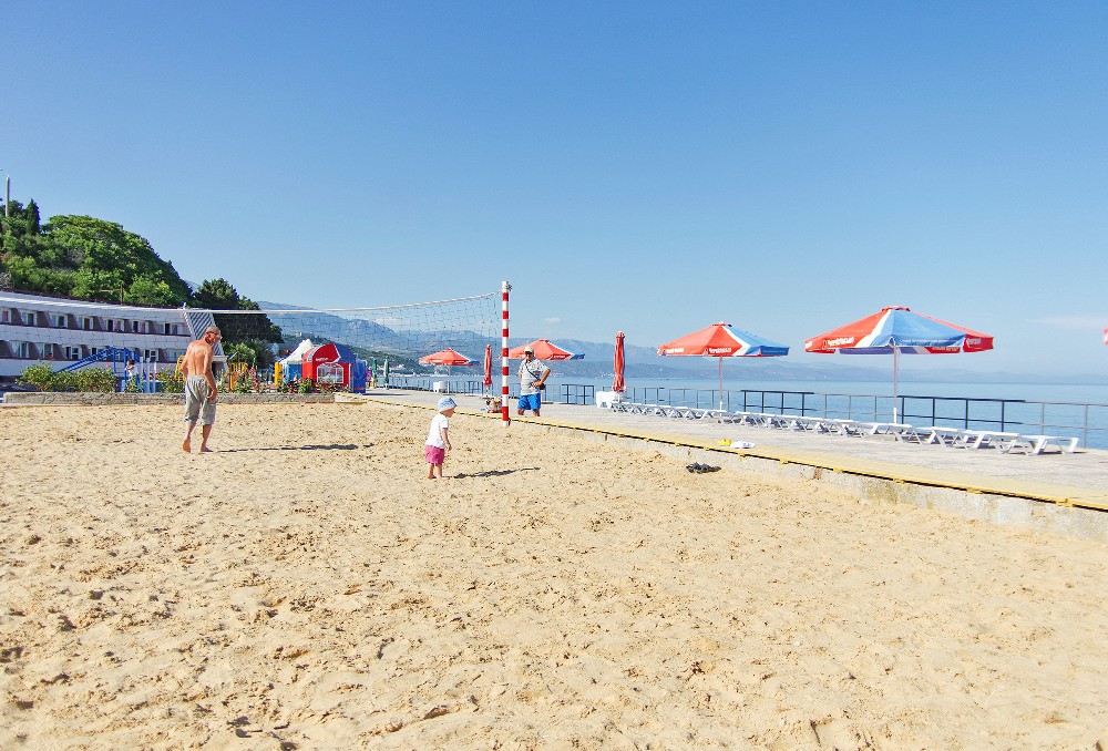 Территория отеля небольшая, включает в себя спортивную зону с волейбольной площадкой, детскую игровую зону, теневую зону с шезлонгами над морем и несколько парковых элементов.