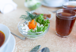 В курортном отеле «Морской уголок» предлагается 3-х разовое комплексное заказное питание. В день заезда и на следующий день – питание по дежурному меню, далее питание по предзаказу за 2 суток из комплексного меню.