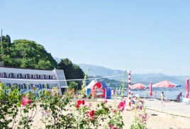 Две карты пляжа отеля "Морской уголок" расположены в 20 метрах от отеля. Пляж состоит из крупной розовой гальки. Левая карта имеет пологий бетонный спуск для колясок. Над пляжем расположена теневая зона, оборудованная шезлонгами и зонтами.