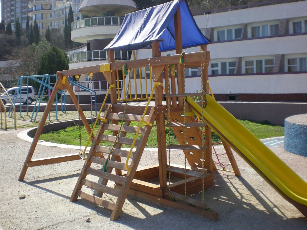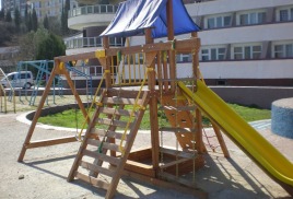 Детская площадка находится перед правым крылом отеля, включает в себя несколько спортивно-развлекательных снарядов для детей разного возраста.