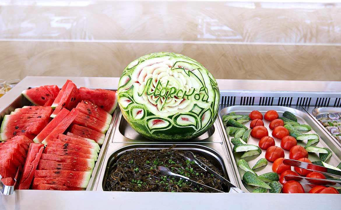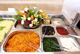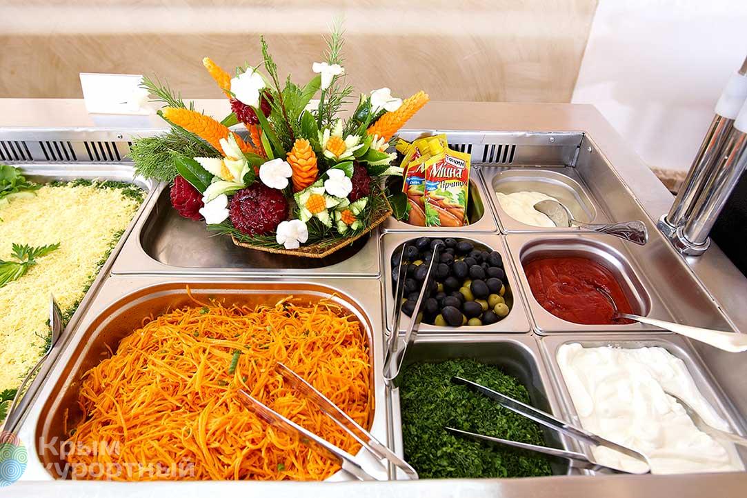 В стоимость проживания входит 2-х разовое питание "завтрак + обед" или "завтрак + ужин" в ресторане «Морской» по системе "Шведский стол". Наши повара очень заботятся о Гостях и используют исключительно свежие продукты. Ежедневно в рационе присутствуют молочные продукты, мясо, рыба, блюда, приготовленные на пару, овощи, фрукты. На обед предлагается крымское вино.