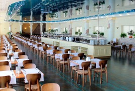 Заранее можно приобрести третье питание 800 руб. с 10 лет и старше, 400 руб. – с 5 до 10 лет, дети до 5 лет бесплатно в сопровождении взрослого (1 взрослый может провести 1 ребенка до 5 лет бесплатно). В ресторане «Морской» предусмотрены стульчики для кормления детей.