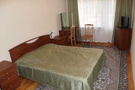 - 2-местный 2-комнатный Люкс. Площадь 32-34 кв.м. В номере: спальня с двумя односпальными или с одной двуспальной кроватью, гостиная с мягкой мебелью, санузел с ванной, телевизор, холодильник, электрочайник, фен, сейф.