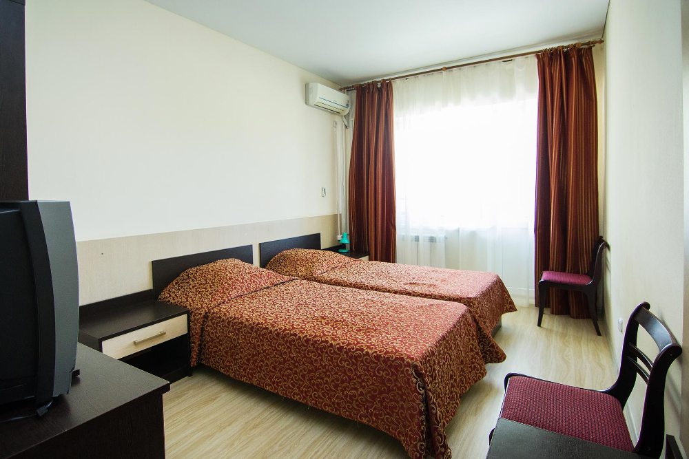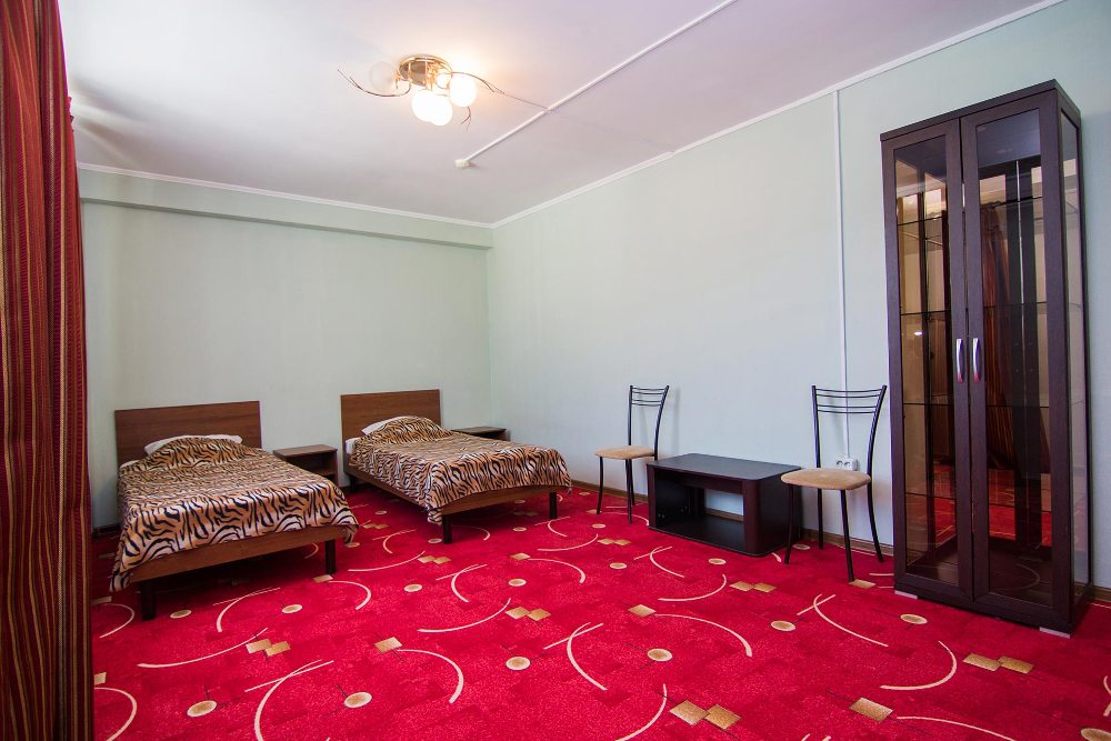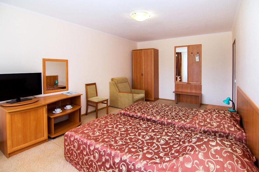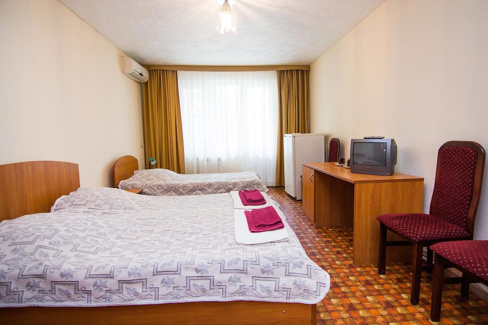 №6 корпус Стандарт Размещение: 2+1 чел., доп. место - раскладушка. В номере: две односпальные кровати, две прикроватные тумбочки, шкаф, зеркало, телевизор, холодильник, сплит-система, половое покрытие - ламинат, три полотенца каждому: банное, для лица и для ног, графин под воду, чайная пара.