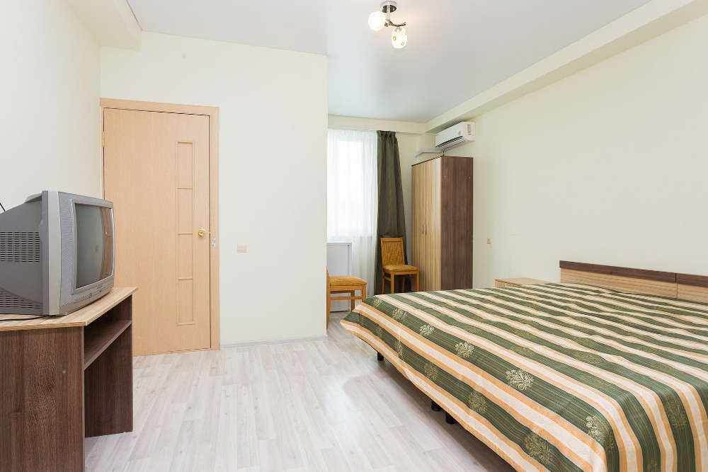 №5 корпус Стандарт Размещение: 2+1 чел., доп. место - раскладушка. В номере: вешалка; две кровати; две прикроватные тумбочки; шкаф; стол; два стула; зеркало; телевизор; холодильник; сплит-система; напольное покрытие (ламинат); балкон 2,9 м2; три полотенца каждому: банное, для лица и для ног; графин под воду; чайная пара.