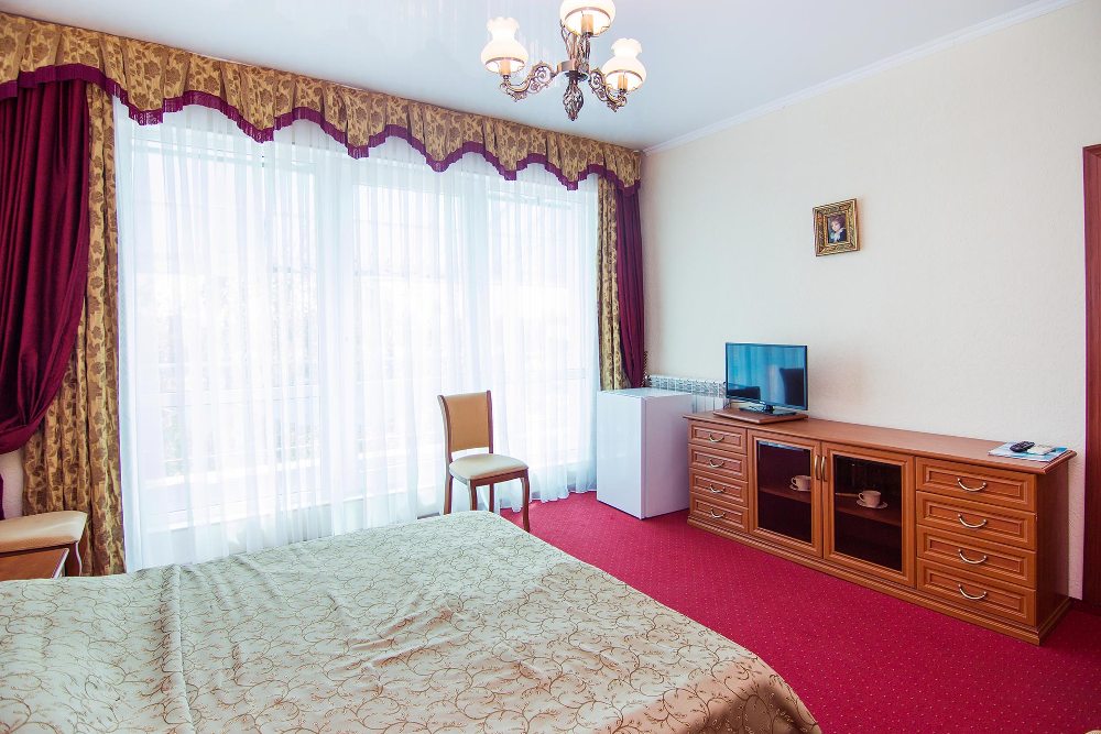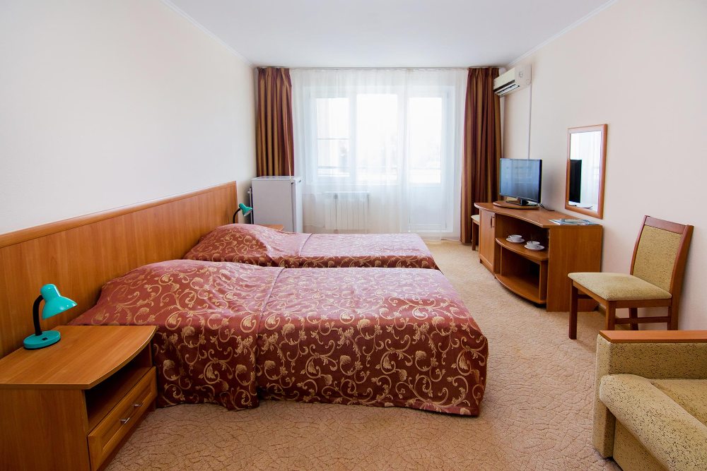 №1 корпус Стандарт Размещение: 2+1 чел., доп. место - кресло-кровать/раскладушка. В номере: две кровати/французская кровать; две прикроватные тумбочки; шкаф; стол; два стула; зеркало; тумбочка под телевизор; телевизор; холодильник; сплит-система; напольное покрытие (ковролин); балкон – 3,3 м2; три полотенца: банное, для лица и для ног; графин под воду; чайная пара.