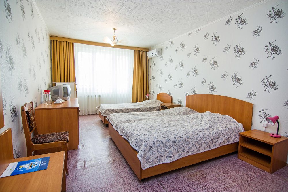 №8 корпус Стандарт Размещение: 2+1 чел., доп. место - раскладушка. В номере: вешалка; две кровати; две прикроватные тумбочки; шкаф; стол; два стула; зеркало; телевизор; тумба под телевизор; холодильник; сплит-система; напольное покрытие (ковровое), балкона нет; три полотенца каждому: банное, для лица и для ног; графин под воду; чайная пара.