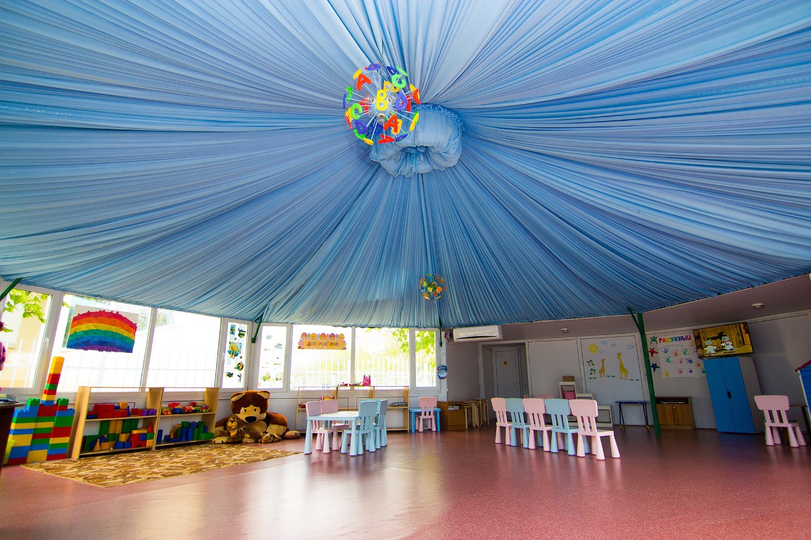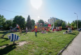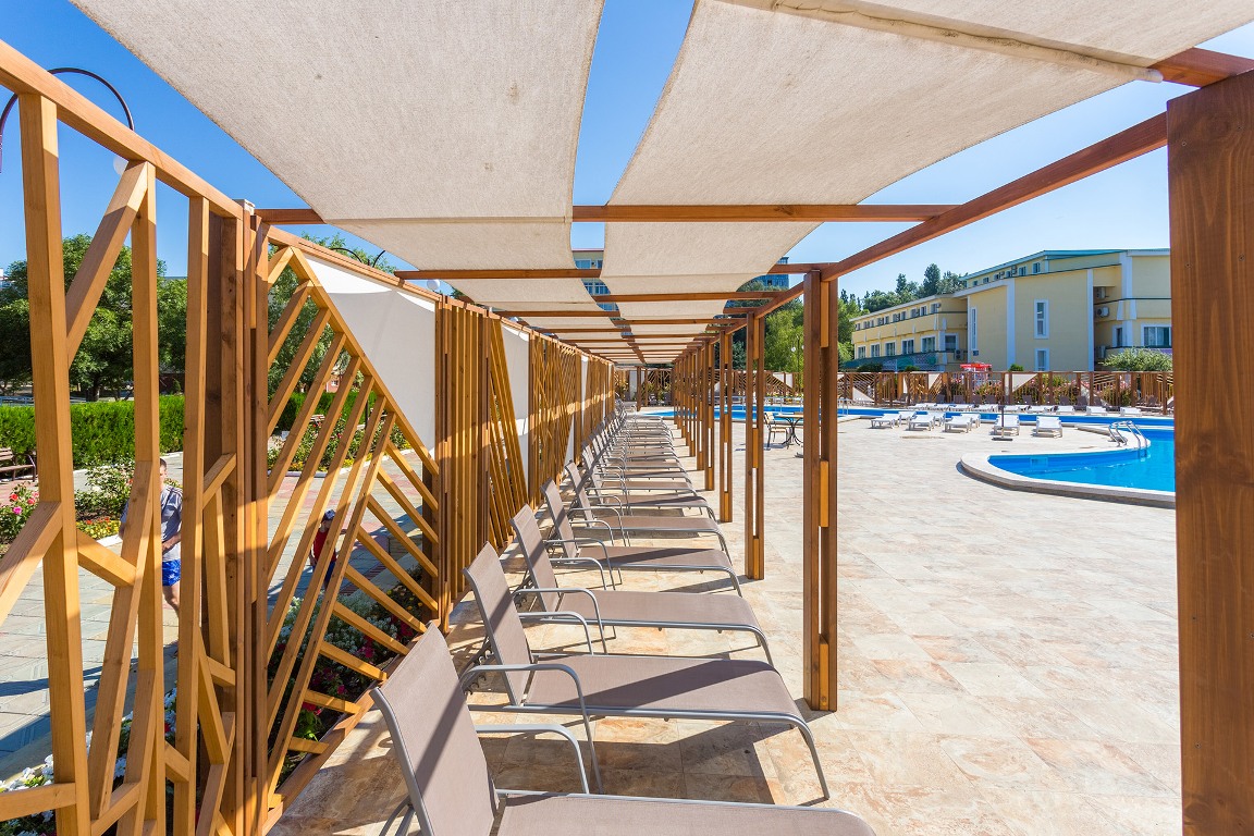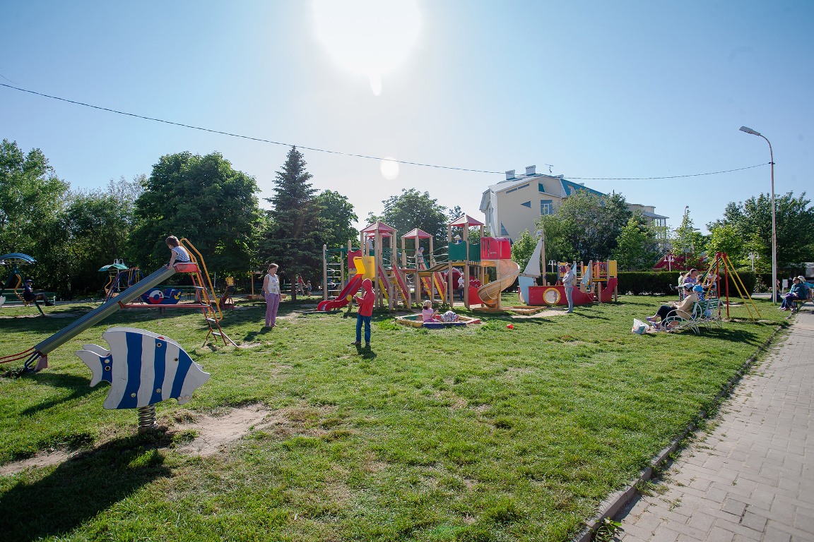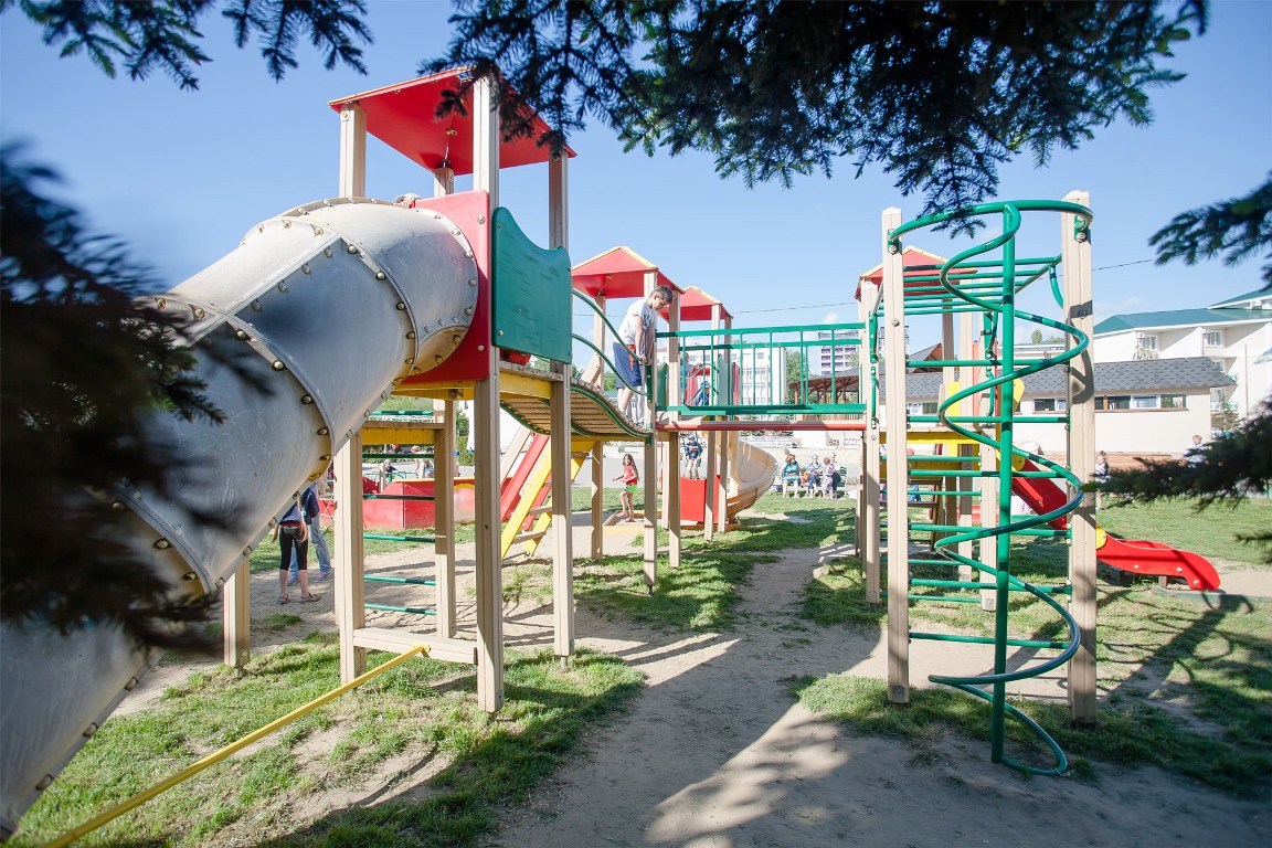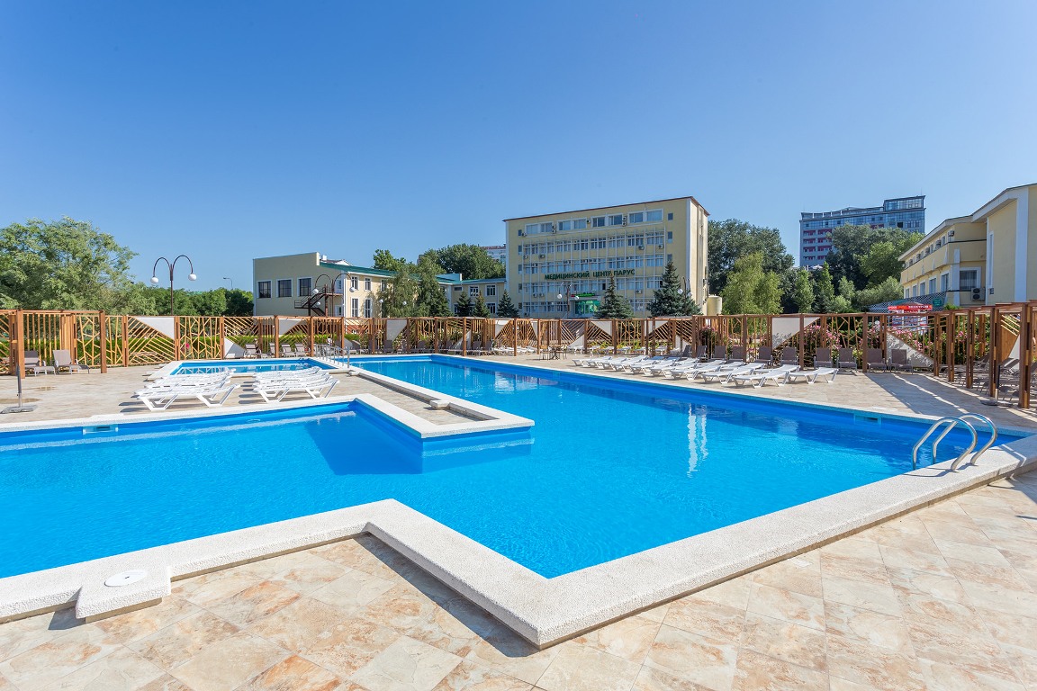Санаторий занимает обширную, утопающую в зелени, благоустроенную территорию площадью 8 гектаров. Тенистые аллеи для прогулок, фонтаны, беседки, яркая подсветка в темное время суток — все это располагает к комфортному отдыху. На территории также есть парк фигурных растений — Топиари.