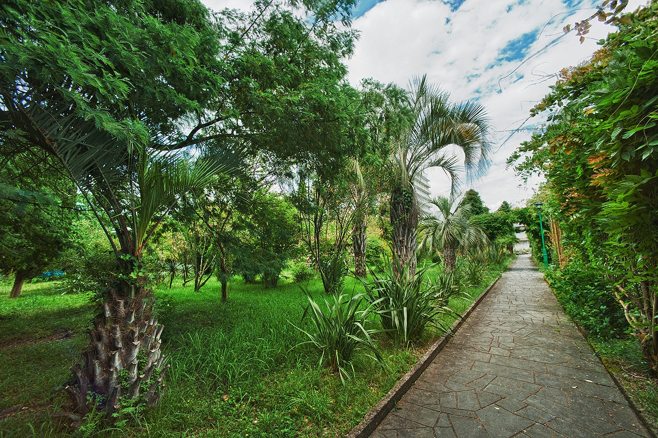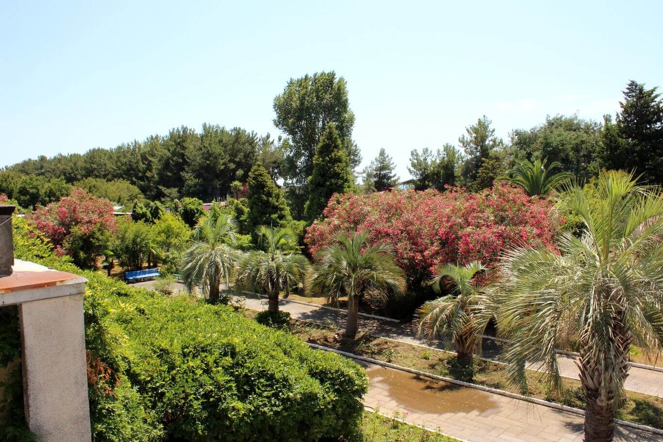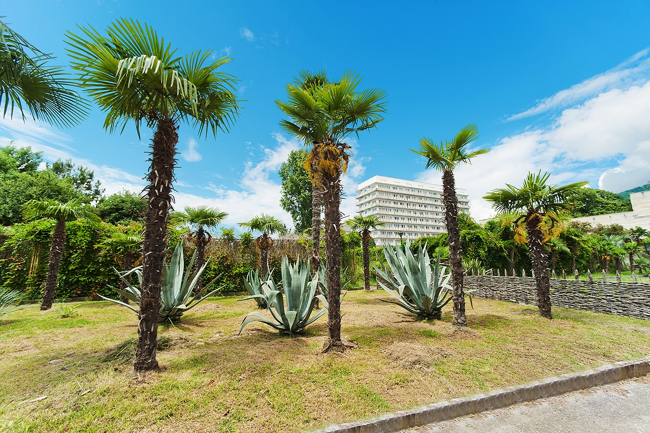На огромной собственной территории, расположился субтропический парк с тенистыми беседками и экзотическими растениями, в том числе с пицундской сосной и самшитом.