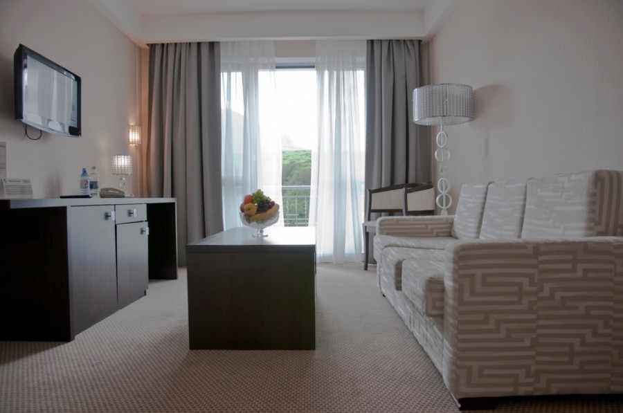 2-х местный 2-х комнатный Люкс (23 номера). Площадь 35 м². В номере: спальня с двуспальной кроватью, гостиная с мягкой мебелью, система кондиционирования воздуха, сейф, LCD-телевизоры в спальне и гостиной, мини-бар, электрический чайник, чайный набор, WI-FI, ванная комната с джакузи или душевой кабиной, фен, халаты,тапочки, балконы в спальне и гостиной. Дополнительное место диван.