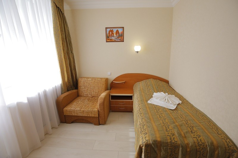 - 1-но местный 1-но комнатный номер с кроватью double. (корпус Приозерный, Лазурный) В номере: шкаф в прихожей, набор посуды, стол, тумбочки, стулья, телевизор (24 телеканала), утюг, чайник,телефон, wi-fi, кровать (1,4 метра), холодильник, санузел,фен, мягкое кресло раскладушка, балкон.