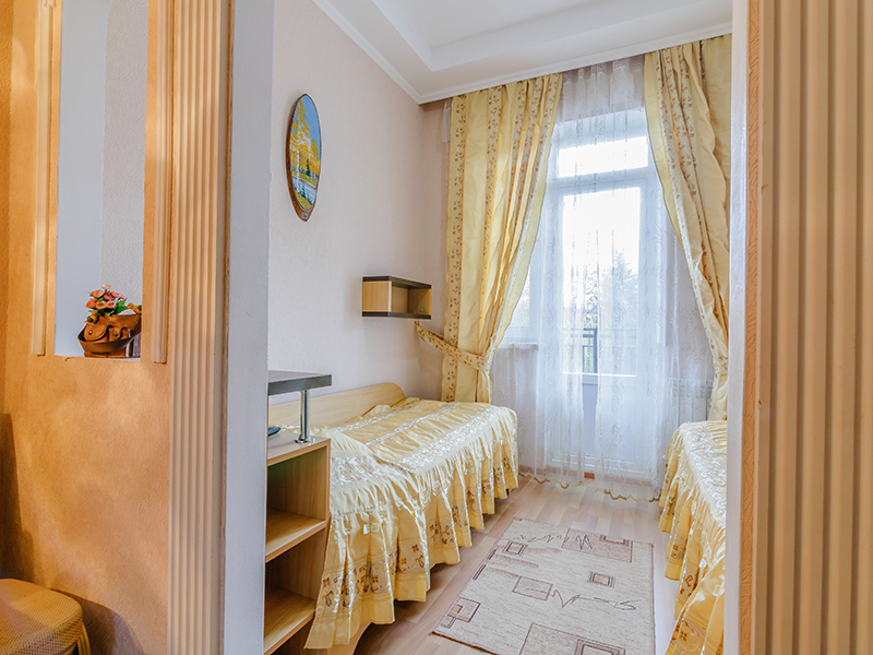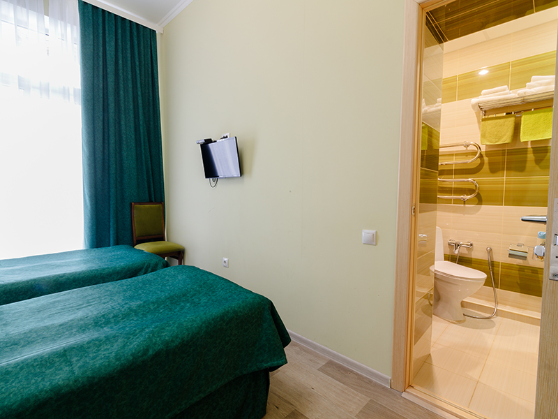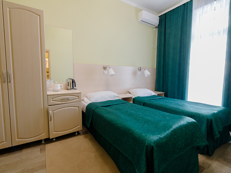 2-х местный стандарт. Площадь 15 м2. В номере: две односпальные кровати, душ, туалет, телевизор, холодильник, фен.