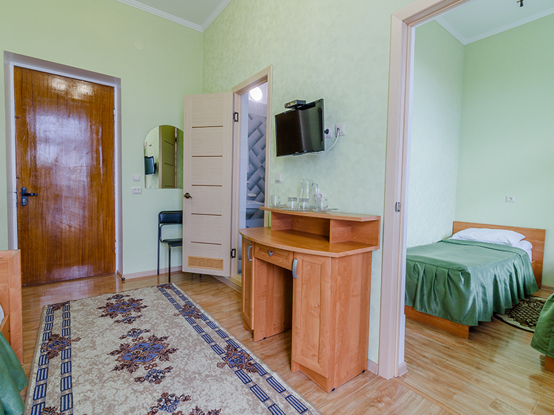 2-х местный 2-х комнатный семейный +. Площадь 19 м2. В номере: гостиная, спальня, душ, туалет, телевизор, холодильник, фен, электрочайник, кондиционер. 2 доп. места