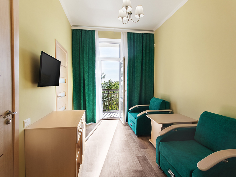 2-х местный 2-х комнатный семейный. Площадь 19 м2. В номере: гостиная, спальня, душ, туалет, телевизор, холодильник, электрочайник.