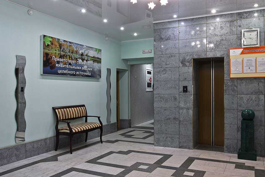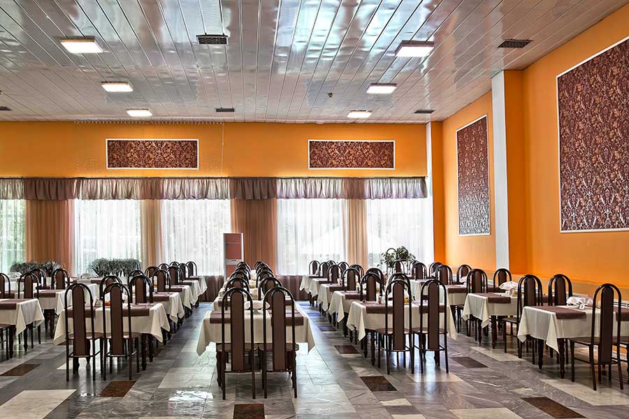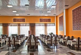 Обеденный зал расположен на 1 этаже санатория. Система питания – 3-х разовое «Шведский стол». Комплексное меню отличается разнообразием. Организовано диетическое питание. Благодаря вежливому обслуживающему персоналу, в столовой царит благоприятна атмосфера.