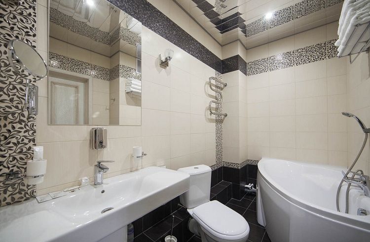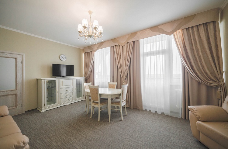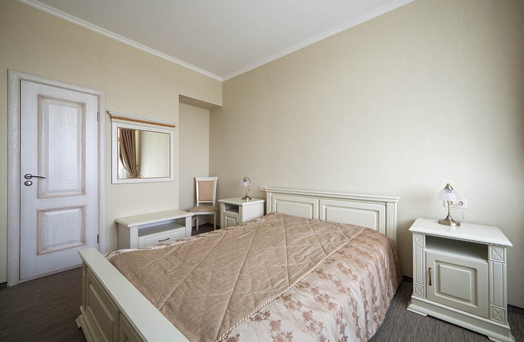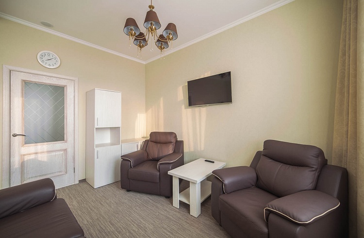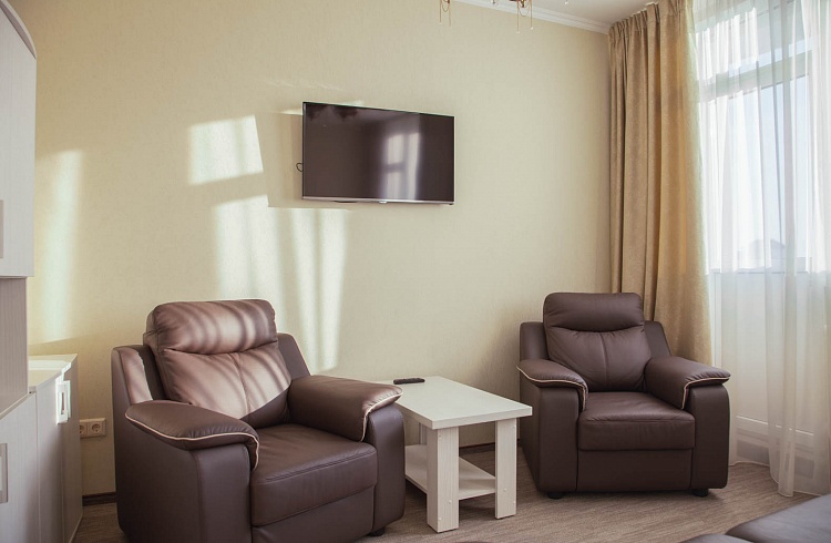 - 1-но местный 1-комнатный номер «Люкс». В номере: душ, умывальник, туалет, ТВ, холодильник, балкон, фен, утюг, чайник, гладильная доска. переносная сушилка, телефон, набор посуды/ 2-х спальная кровать, диван, набор корпусной мебели. Возможно 2 дополнительных места.