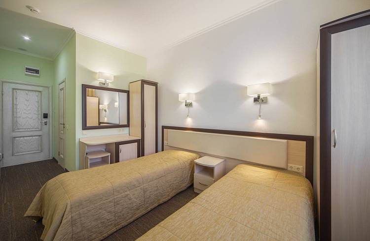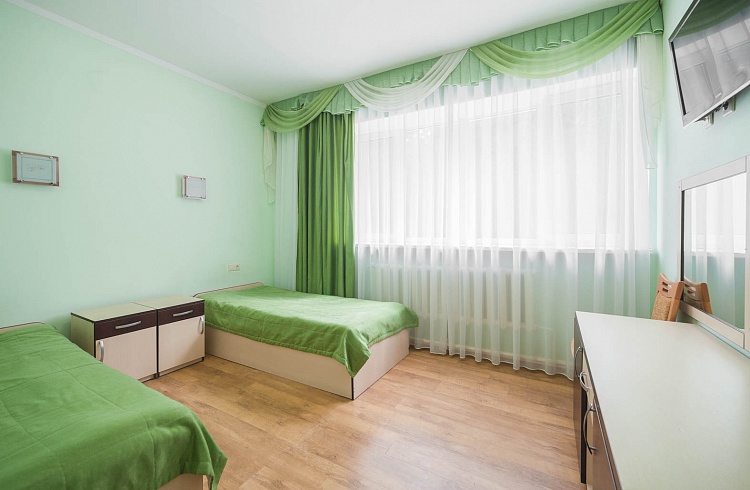 - 2-х местный 1-комнатный номер. В номере: балкон, душ, умывальник, туалет, ТВ, холодильник, чайник, 2 односпальных кровати, тумбочки, стулья, шкаф, ремонт 2012 -2014гг.