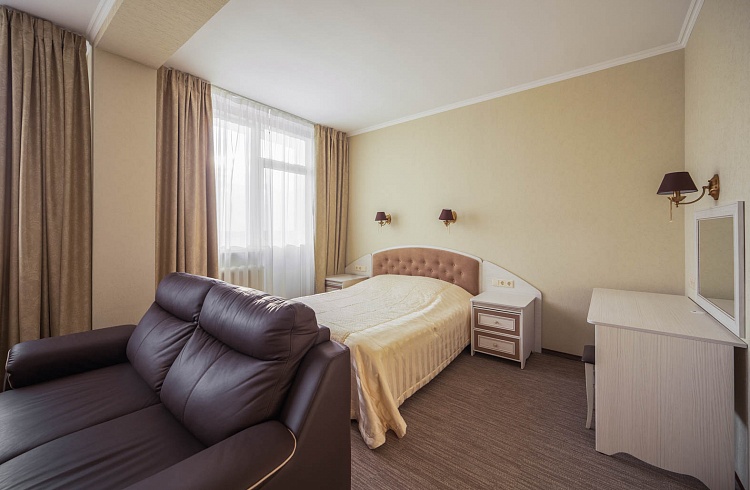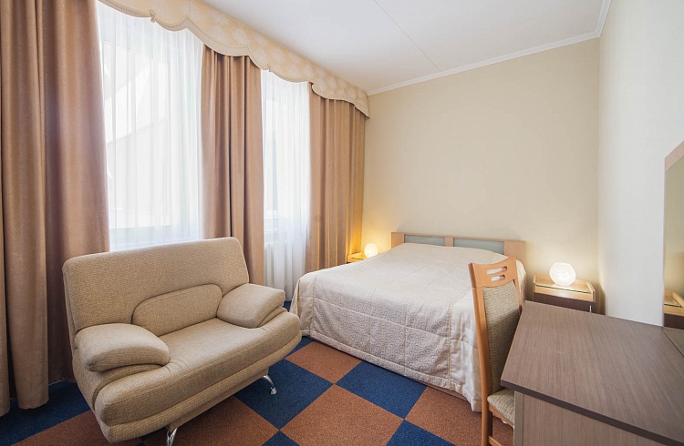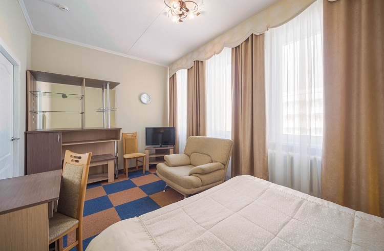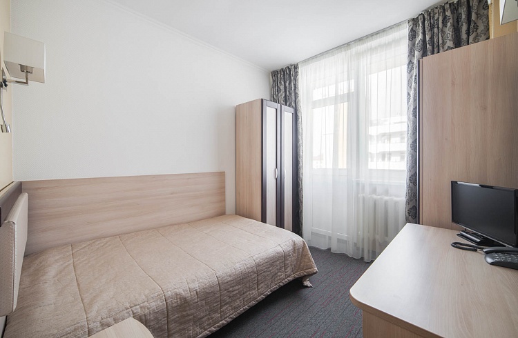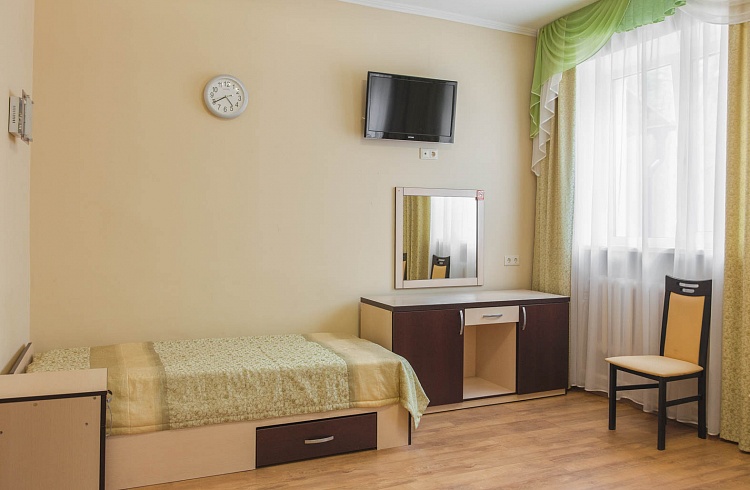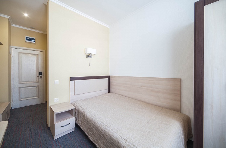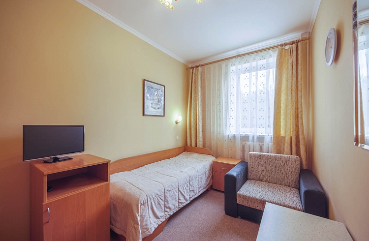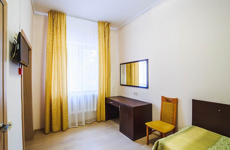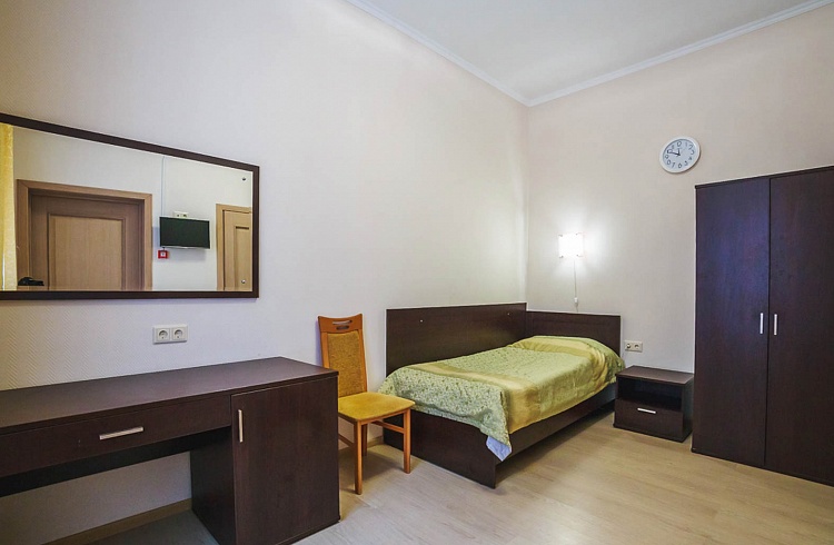 - 1-но местный 1-комнатный номер без балкона. В номере: душ, умывальник, туалет, фен, ТВ, холодильник, чайник, односпальная кровать, стол, стул, кресло-кровать, шкаф, тумбочка, ремонт ранее 2012 года.