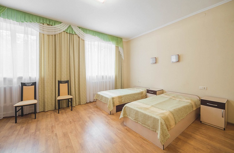 - 2-х местный 1-но комнатный номер. В номере: душ, умывальник, туалет, фен, ТВ, холодильник, чайник, 2 односпальных кровати, тумбочки, стулья, шкаф в прихожей.