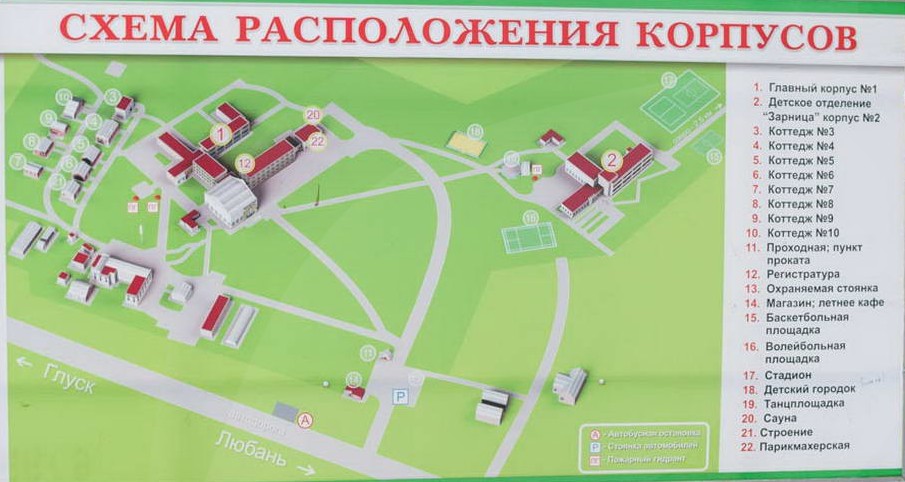 Адрес: Беларусь, Минская область, Любанский район, п/о Осовец, Санаторий «Рассвет-Любань».