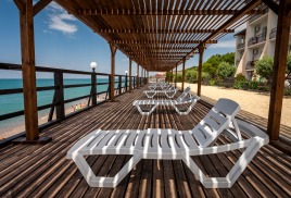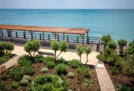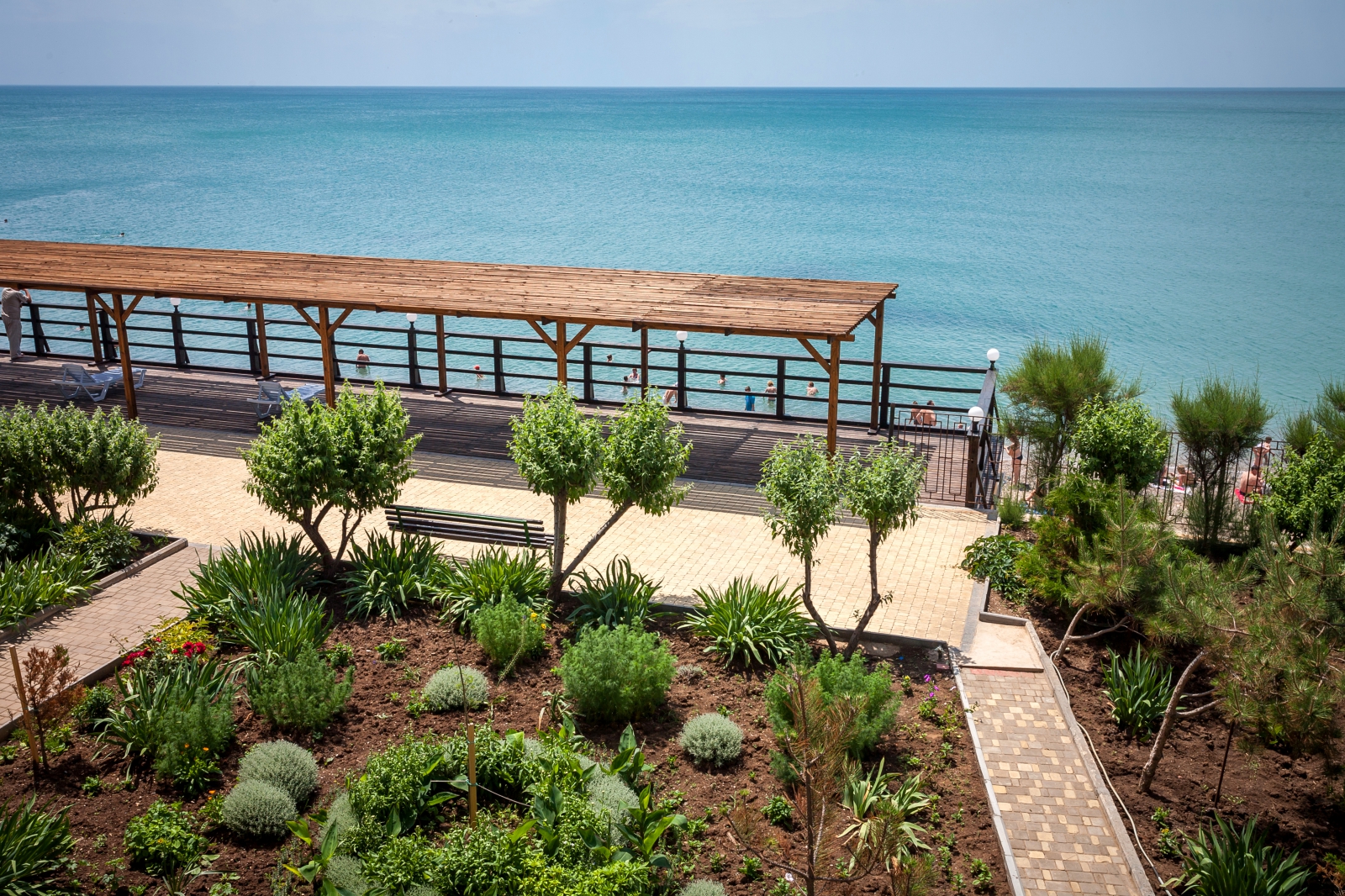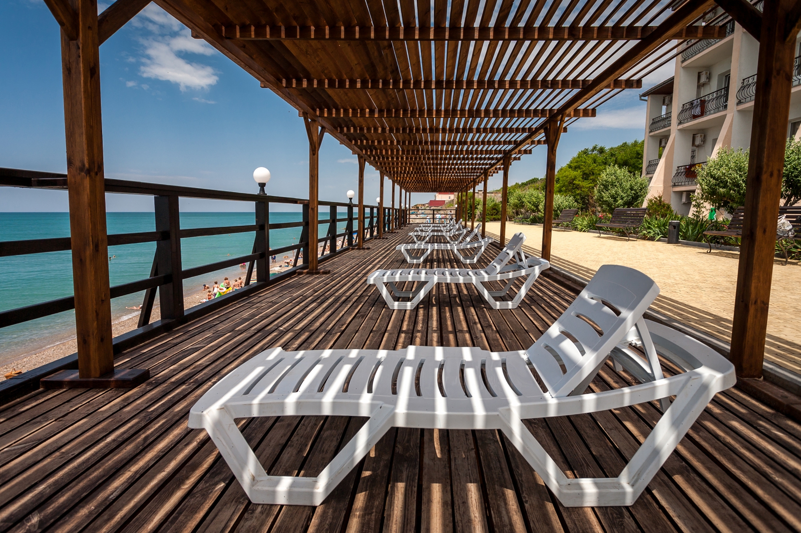 Пансионат расположен на первой береговой линии. Пляж песчано – галечный, пологий морской спуск с плотным песчаным дном. На территории пансионата рядом с пляжем расположена деревянная палуба с навесами и прокатом шезлонгов за дополнительную плату. Есть бар, кабинки для переодевания, навесы, водные развлечения.