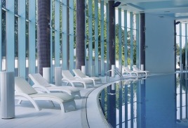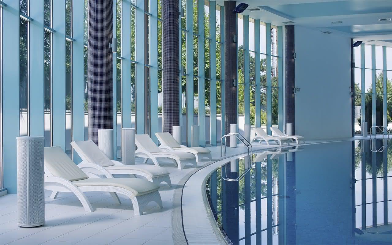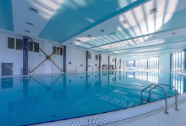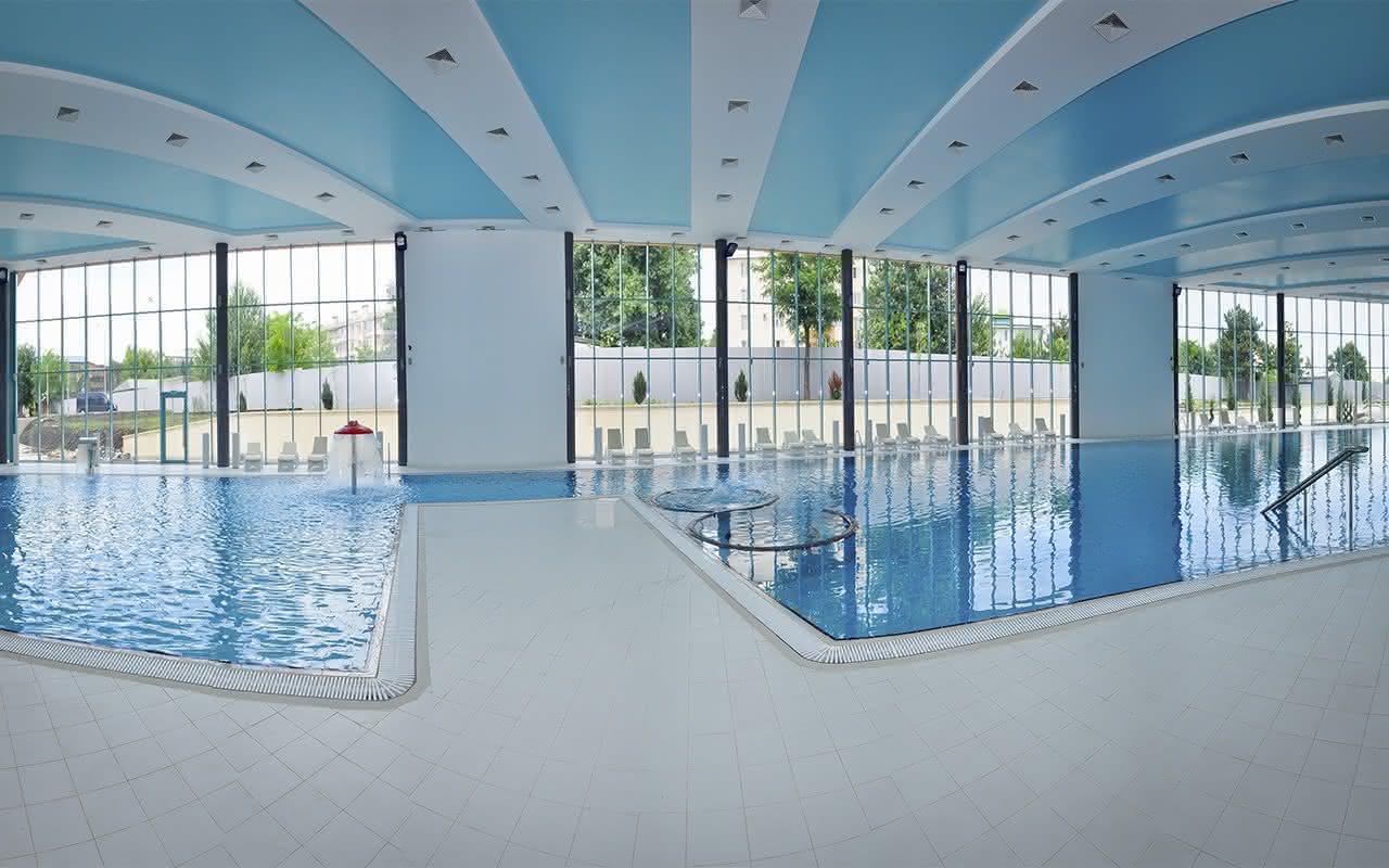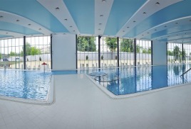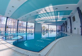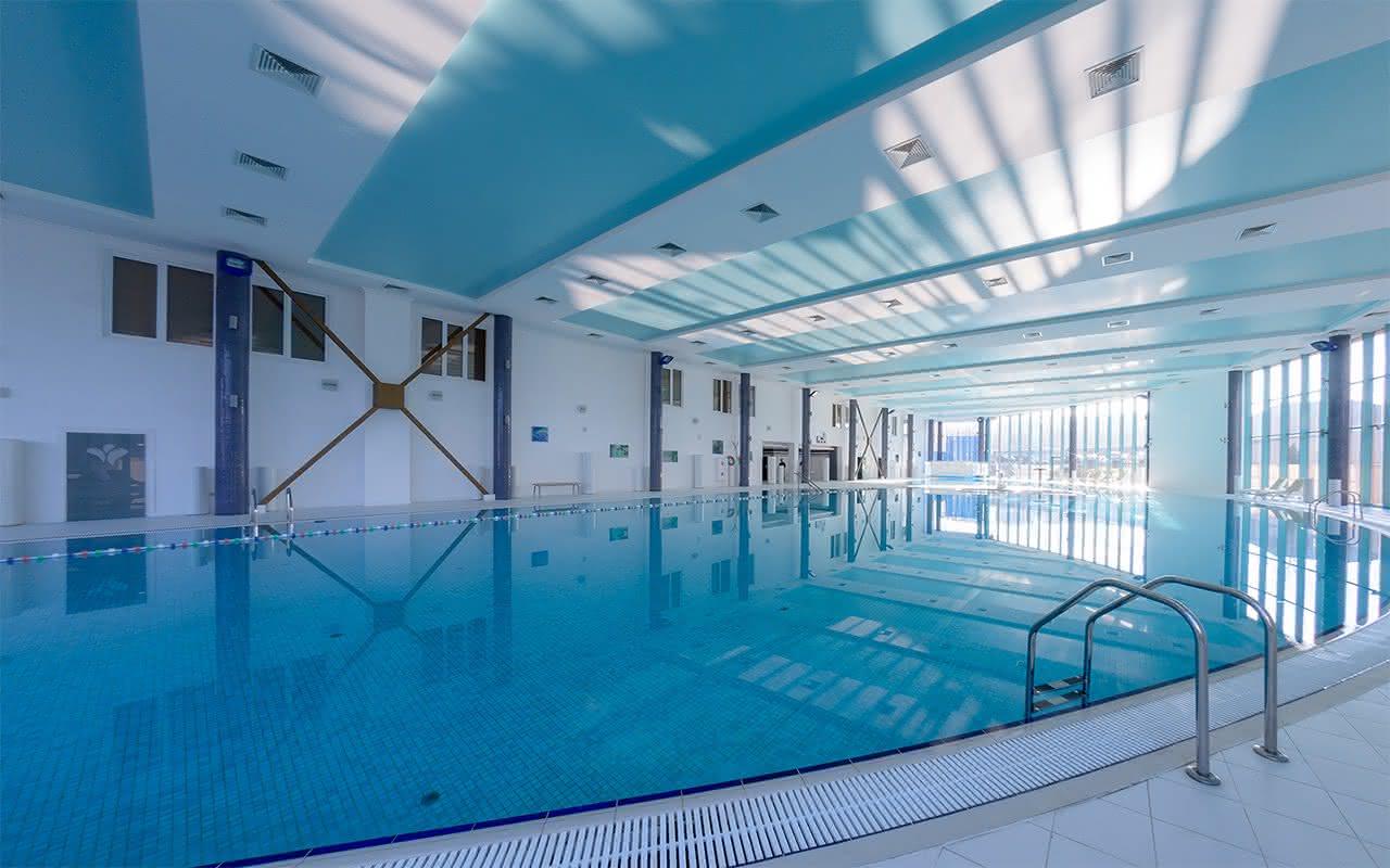 Бассейн комплекса имеет особые зоны термотерапии, джакузи, каскада и эффекта морской волны. По всему его периметру располагается закрытая терраса с шезлонгами для приема солнечных ванн в комфортной обстановке. В мужской и женской раздевалках есть мини-сауны, где можно согреться и расслабиться после купания.