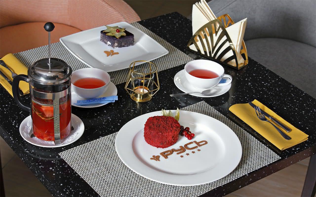 Изюминка лобби-бара - изысканные десерты от кондитеров санатория «Русь»: чизкейк, красный бархат, тирамису, макарунсы.
