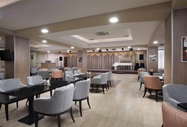 Зал рассчитан всего на 40 человек и оснащен комфортной мягкой мебелью и удобными, уже сервированными столами на 2 или на 4 Гостей.