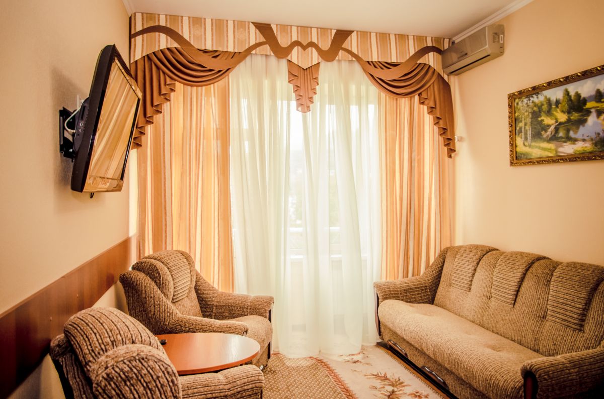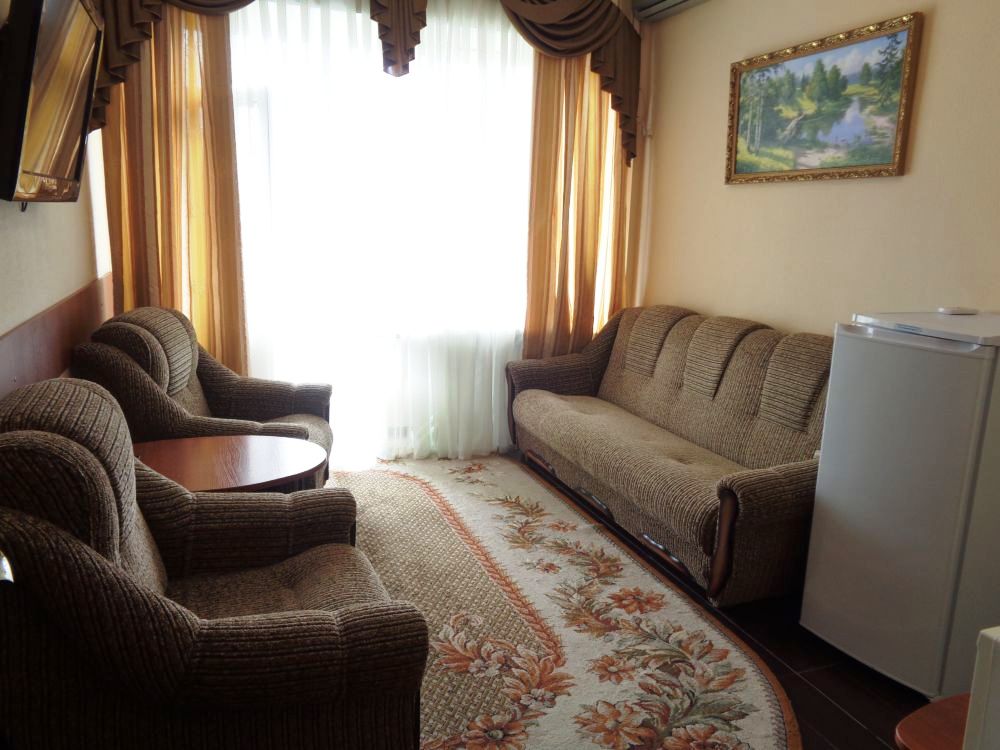 2-х местный 3-х комнатный Люкс. Площадь номера: 35-40 кв.м. В номере: спальня с двуспальной кроватью, гостиная с мягкой мебелью, телевизор, холодильник, кабинет, санузел с ванной, биде, фен, балкон.