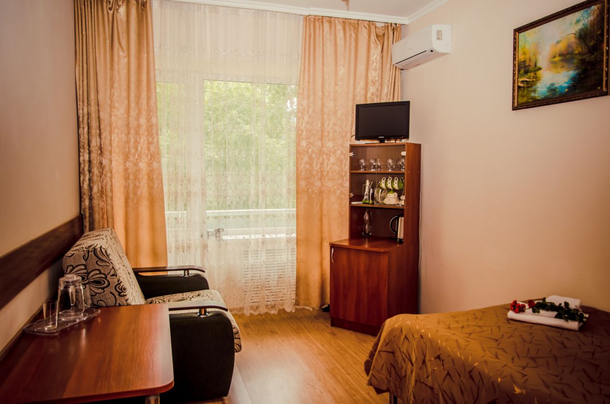 1-но местный 1-но комнатный стандарт. Площадь номера: 12 кв.м. В номере: кровать, телевизор, холодильник, санузел с ванной, балкон.