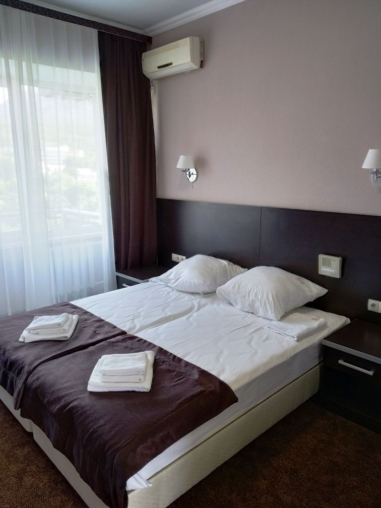 2-х местный 1-но комнатный стандарт. Площадь номера: 15 кв.м. В номере: две кровати, телевизор, холодильник, санузел с ванной, балкон.
