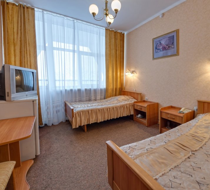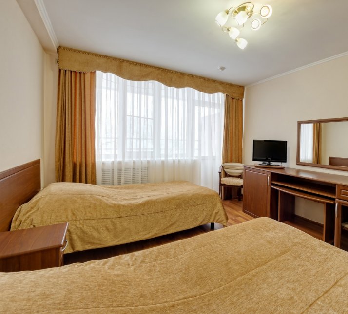 - 2-х местный номер 2 категории. Площадь 13 кв. м.. В номере: 2 односпальые кровати, санузел (душ с поддоном или душевая кабинка, раковина, туалет), телевизор, холодильник, сейф, электрочайник.
