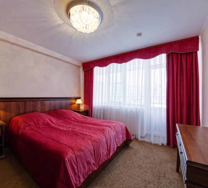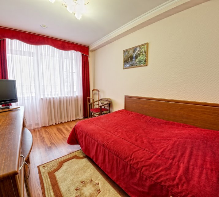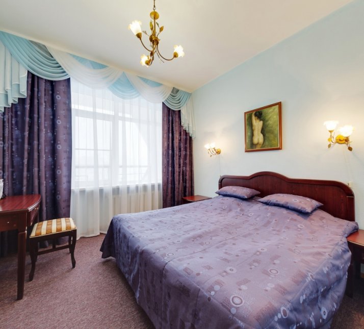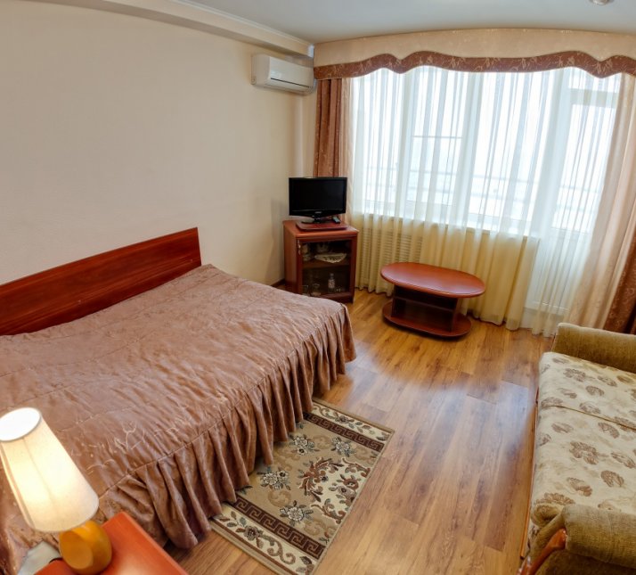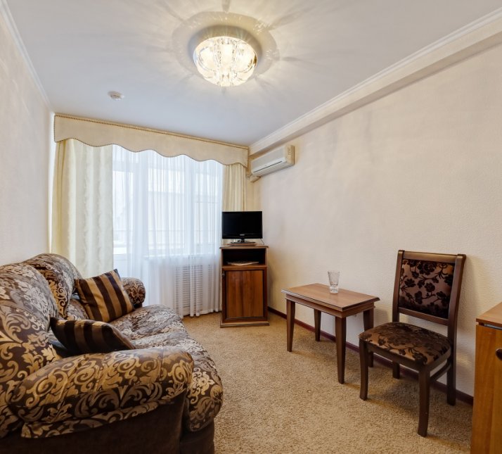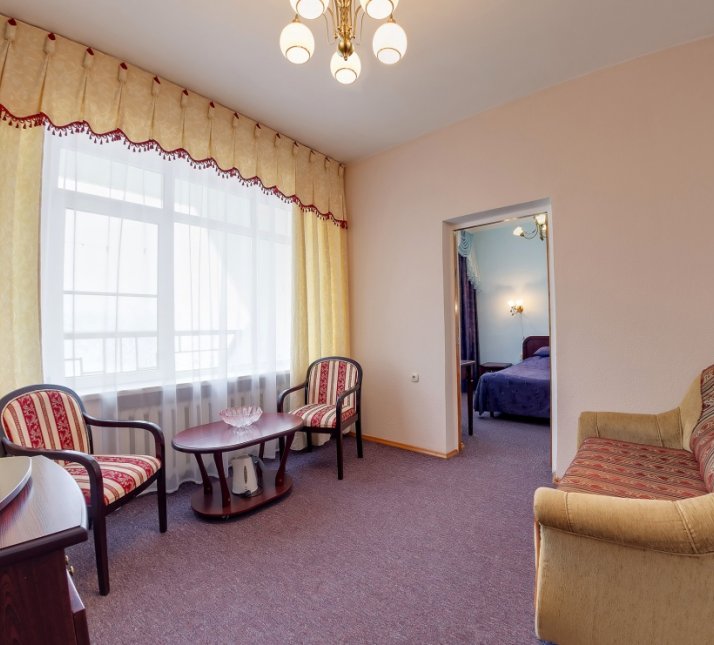 - 2-х местный 2-х комнатный Люкс. Площадь 23 кв. м.. В номере: гостиная с мягкой мебелью, спальня (2 кровати односпальные или двуспальная кровать), санузел (ванна, туалет, раковина, фен) телевизор, холодильник, кондиционер, мини-сейф, электрочайник.