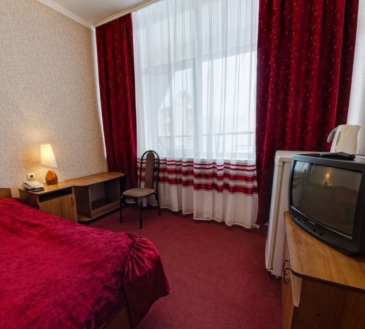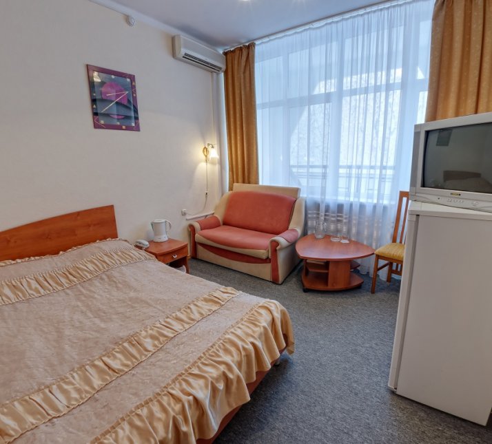 - 1-но местный номер 1 категории. Площадь 13 кв. м.. В номере: односпальная кровать, санузел (душевая кабина, туалет, раковина, фен), телевизор, холодильник, кондиционер, мини-сейф, электрочайник.
