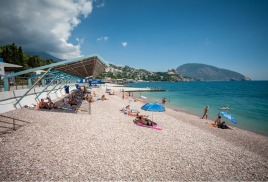 Мелко-галечный лечебный пляж санатория "Гурзуфский" расположен в 200 метрах от корпусов. Благоустроенный, изолированный, протяженностью 240 метров. Пляж оборудован тентами, раздевалками, душем и туалетами, шезлонгами и индивидуальными зонтами от солнца. На территории пляжа работают спасатели и медпункт с дежурной медсестрой, зона wi-fi покрытия.