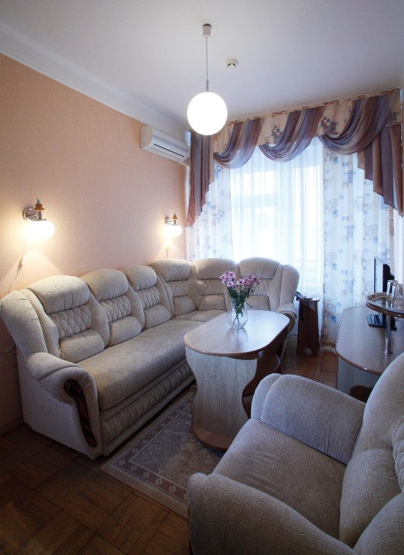 - 2х-местный 1-комнатный номер «Люкс улучшенный» - двухкомнатный номер, состоящий из уютной гостиной, комфортабельной спальни, прихожей и балкона. Оснащение номера: кровать 1,60 см/1,80 см. или две односпальные кровати; доп. место – раскладной диван; ТВ; холодильник; кондиционер; чайник, набор посуды. Оснащение ванной комнаты: ванная или душевая кабина; туалет один или два; фен.