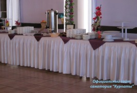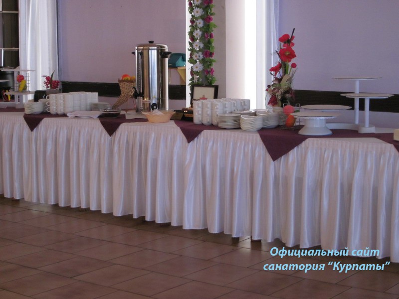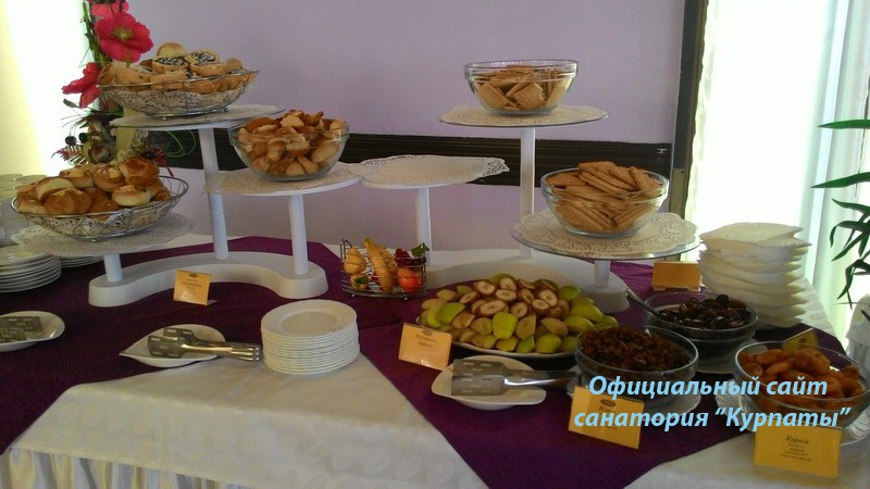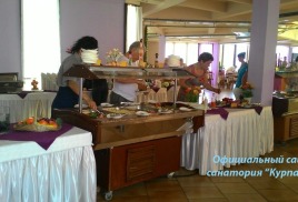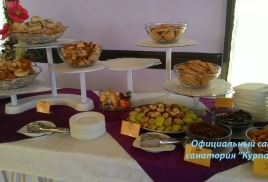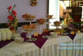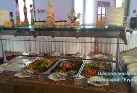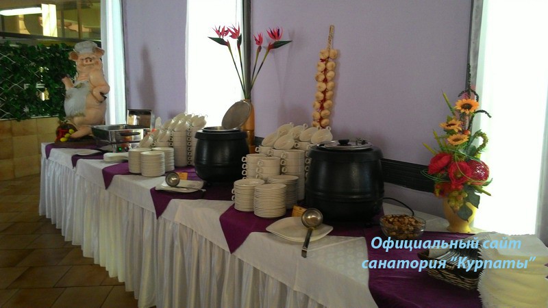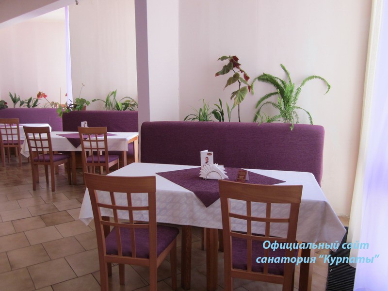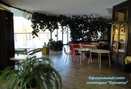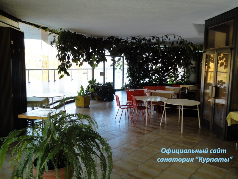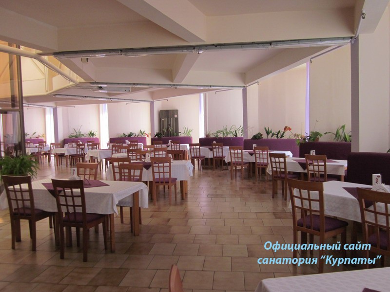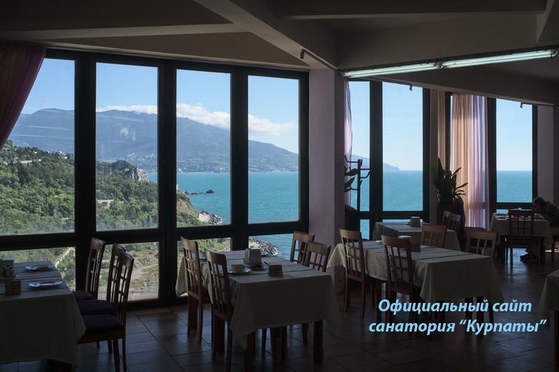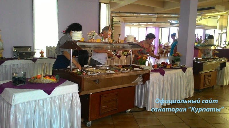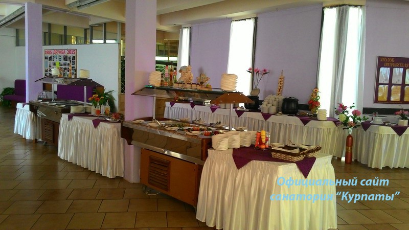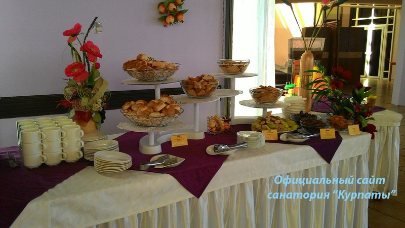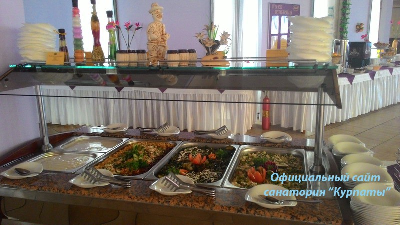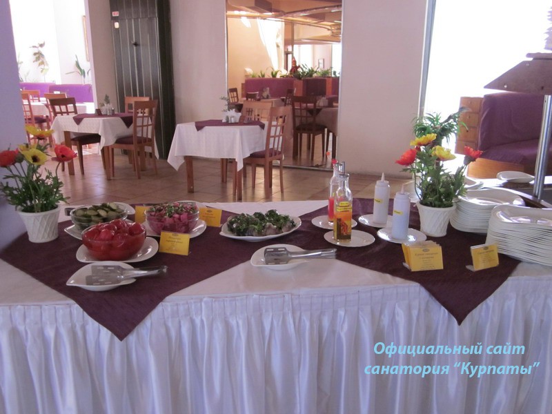 Питание в санатории "Курпаты" 3-х разовое. Столовая находится в корпусе "Дружба" на 7 этаже, откуда открывается великолепный вид на море.