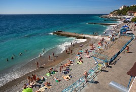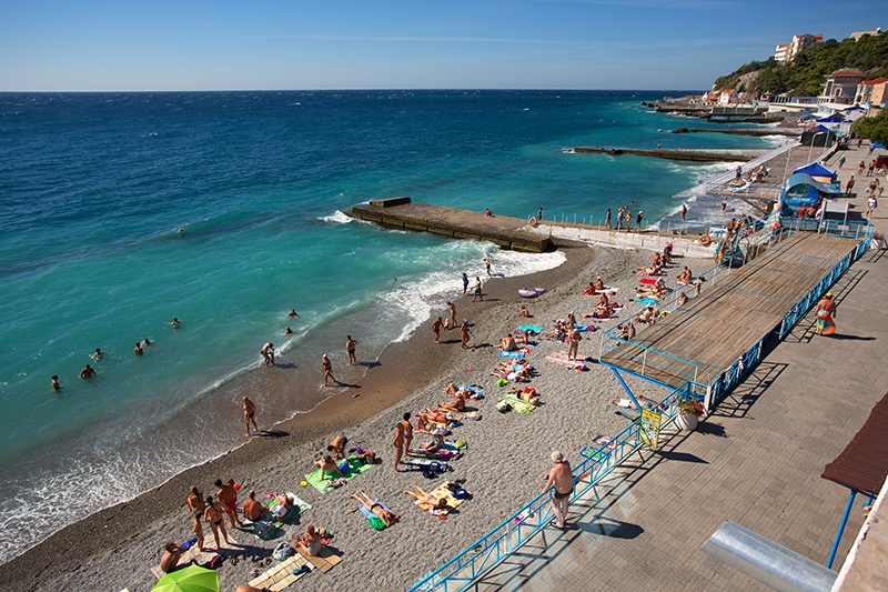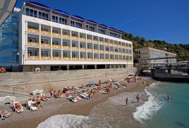 Галечный протяженностью 200 метро. На пляже: душевые, кабинки для переодевания, лежаки (входят в стоимость), навесы, медицинский пост (работает в летний период), пункты проката, сувенирные лавки, туалет. Для того чтобы попасть на пляж от корпусов 1,2,3, можно использовать лифт, расположенный около второго корпуса или пройти аллеями парка пешком.